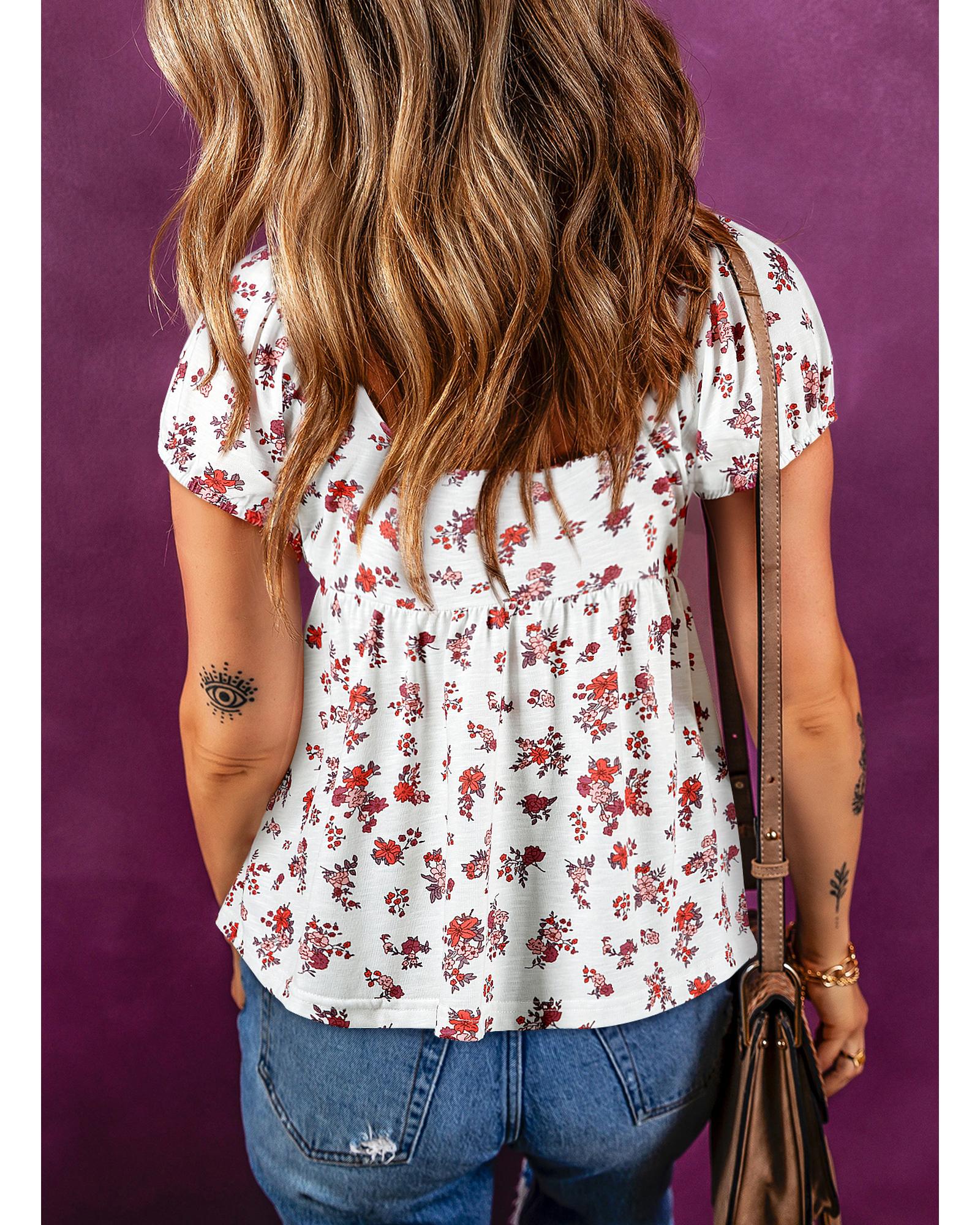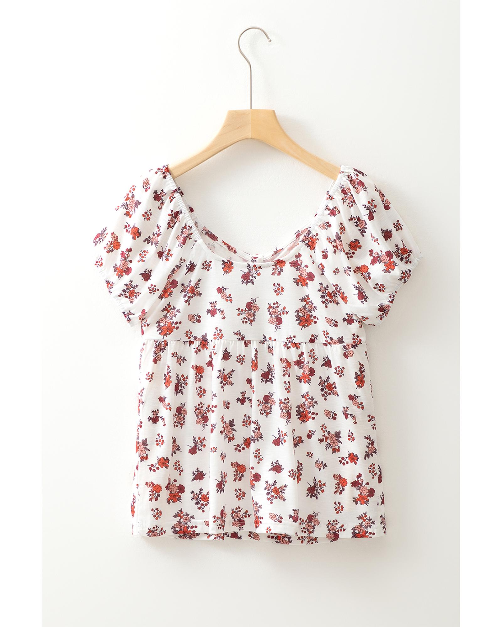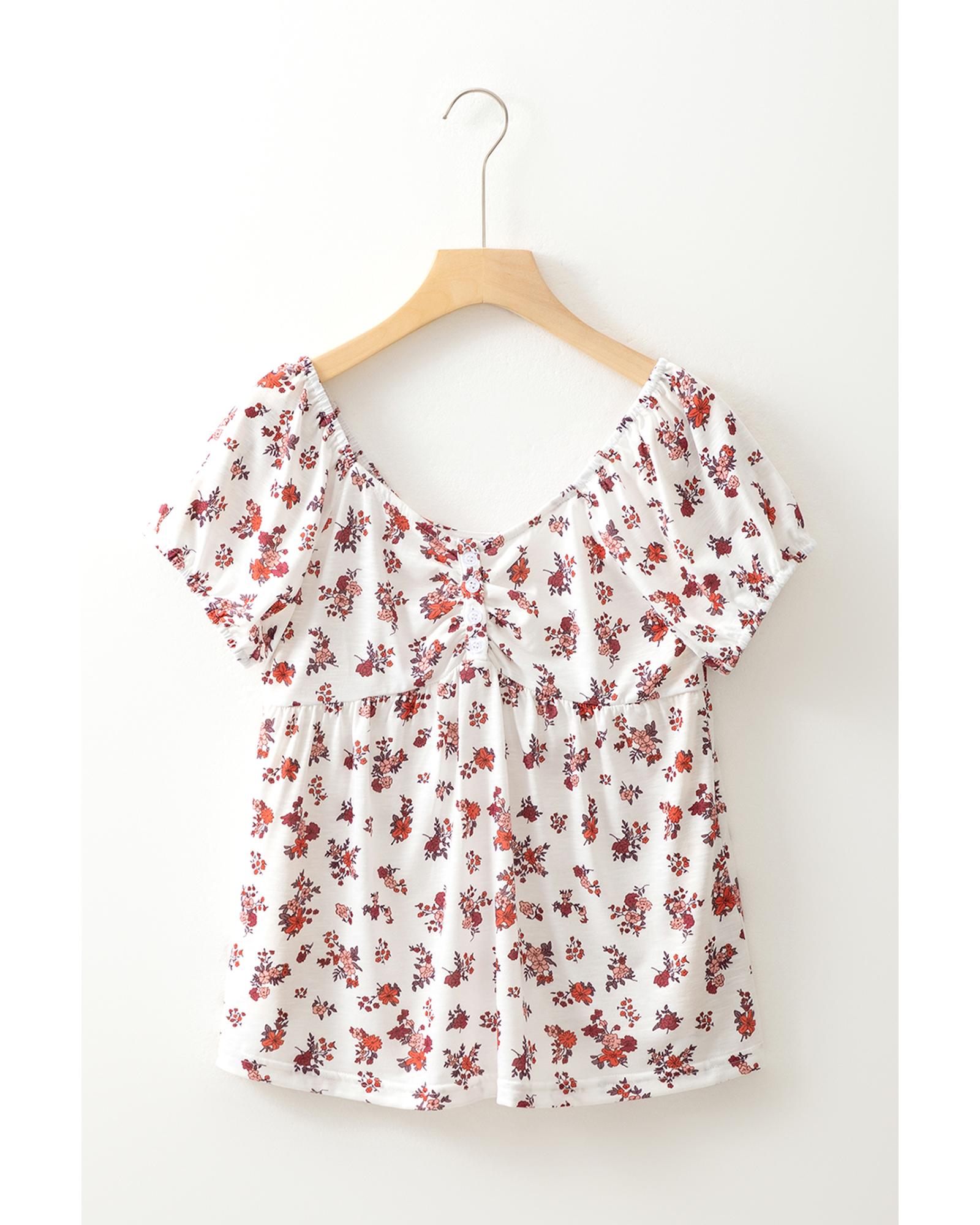 White Boho Floral Ruched Cinched Short Sleeve Blouse – L