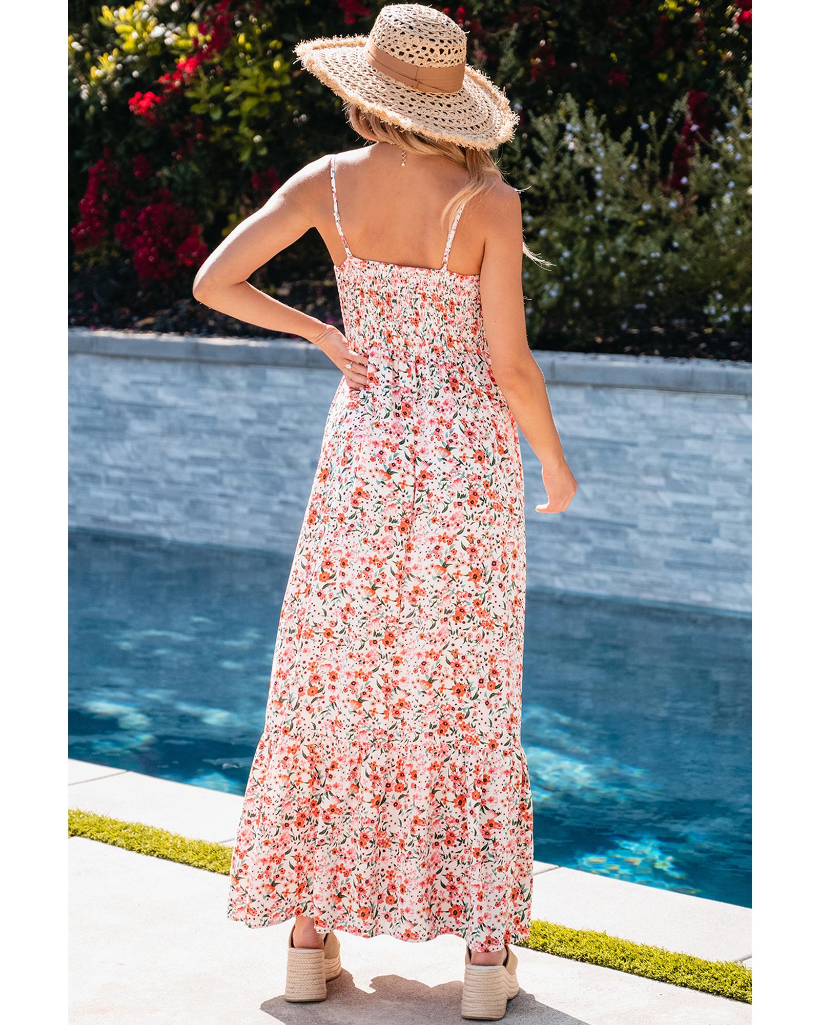 This maxi dress features a boho floral print with a smocked bodice and ruffled details, creating a chic and flowy silhouette. It is designed for a trendy fitted look and is suitable for travel and photoshoots, making it a versatile addition to your summer wardrobe.