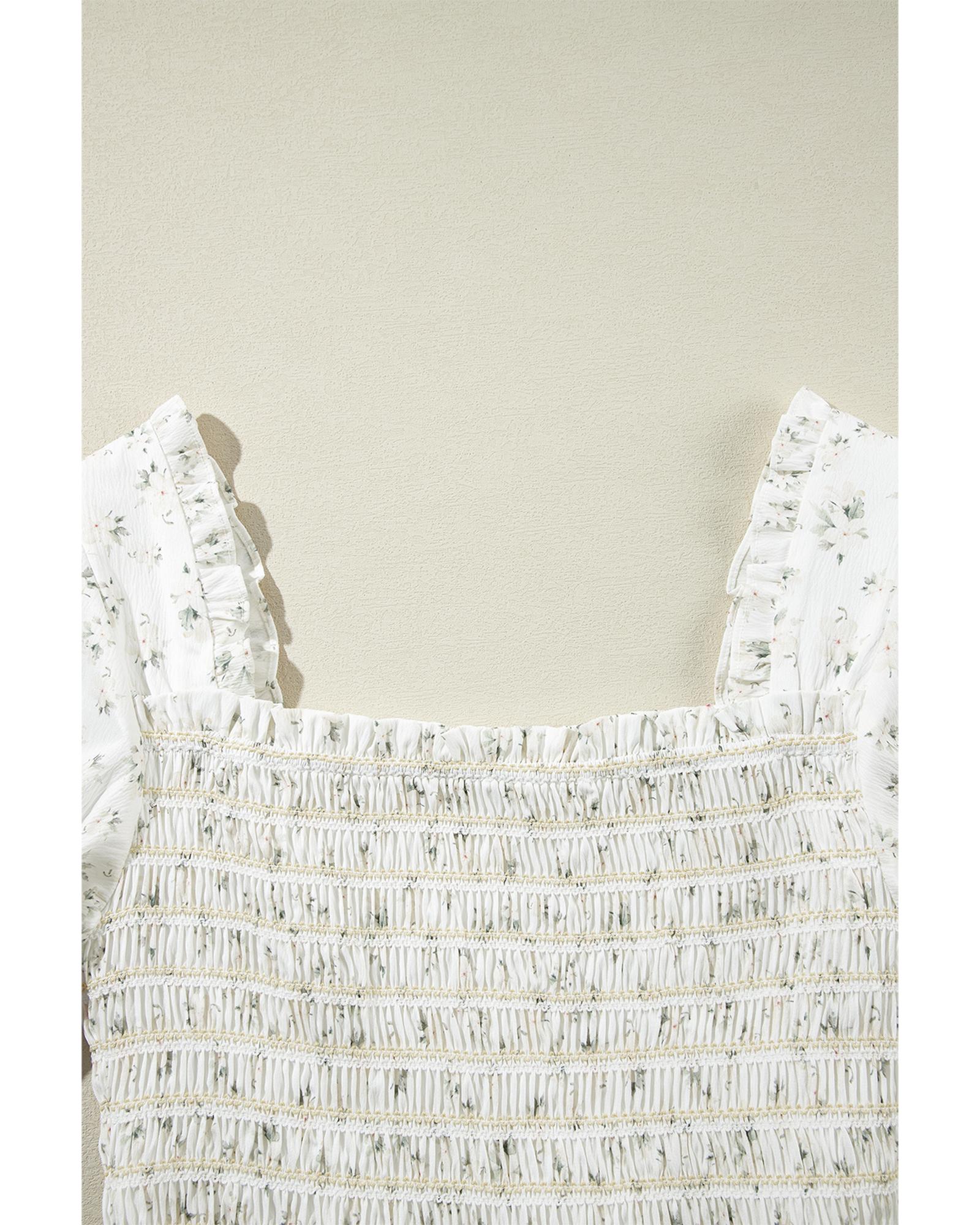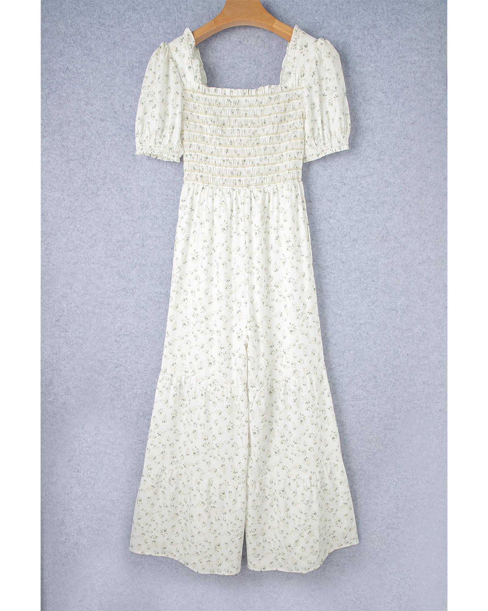 This stylish jumpsuit features a boho floral design with a flattering smocked bodice and a square neckline. It combines a high waist and wide-leg silhouette, making it suitable for holidays and various occasions. The short puff sleeves add a trendy touch to the overall look.