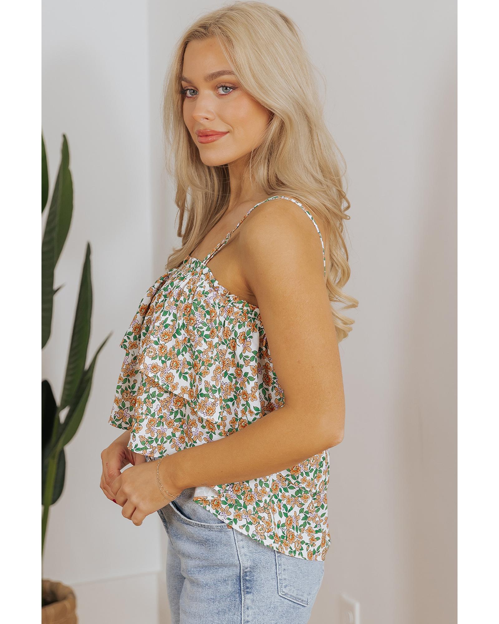 This summer tank top features a charming floral design with playful ruffle details, making it an ideal choice for warm weather. The lightweight fabric provides breathability and comfort, perfect for casual outings or relaxed occasions.