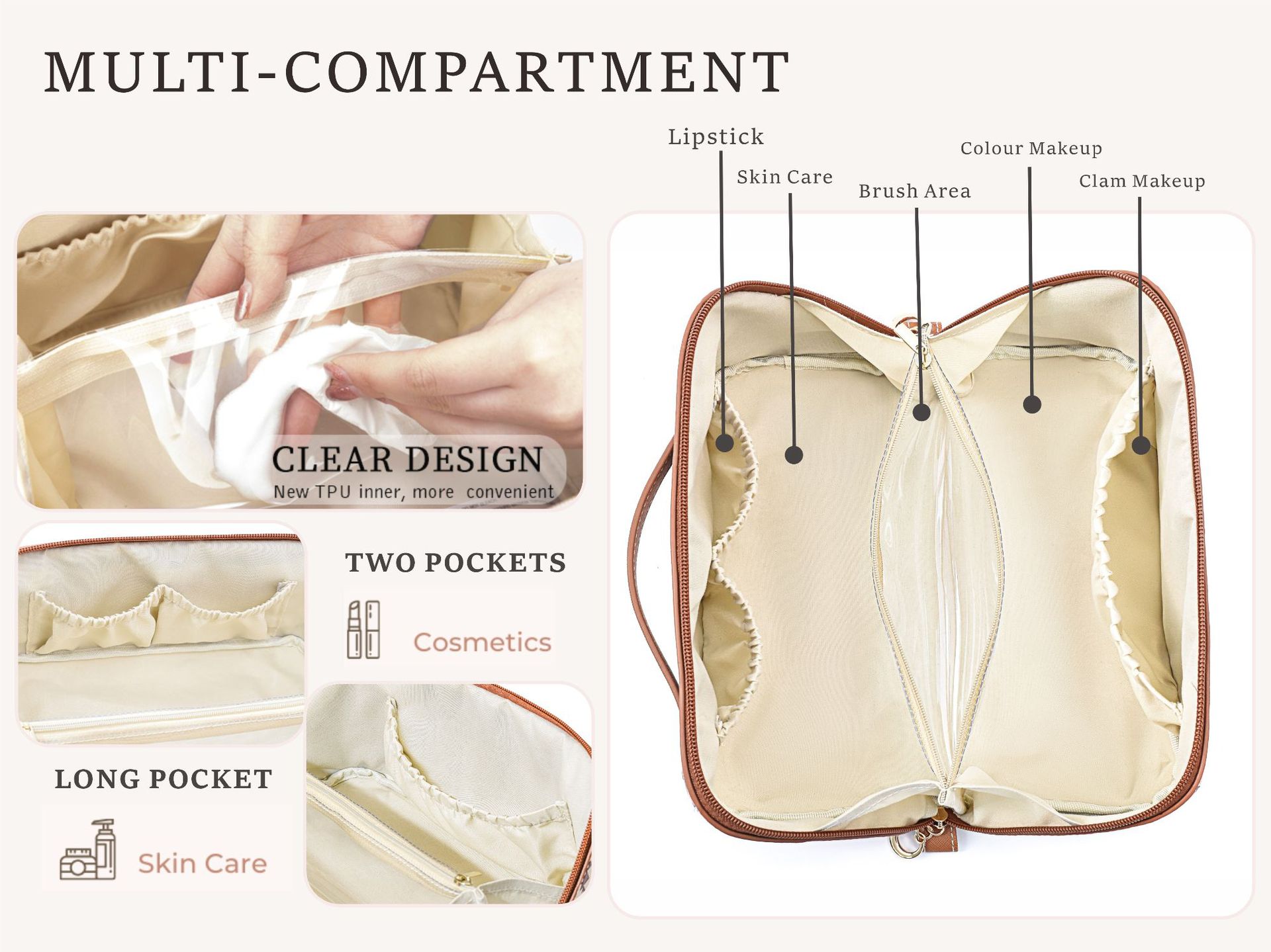 - Spacious interior with multiple compartments for makeup, skincare, and toiletries
