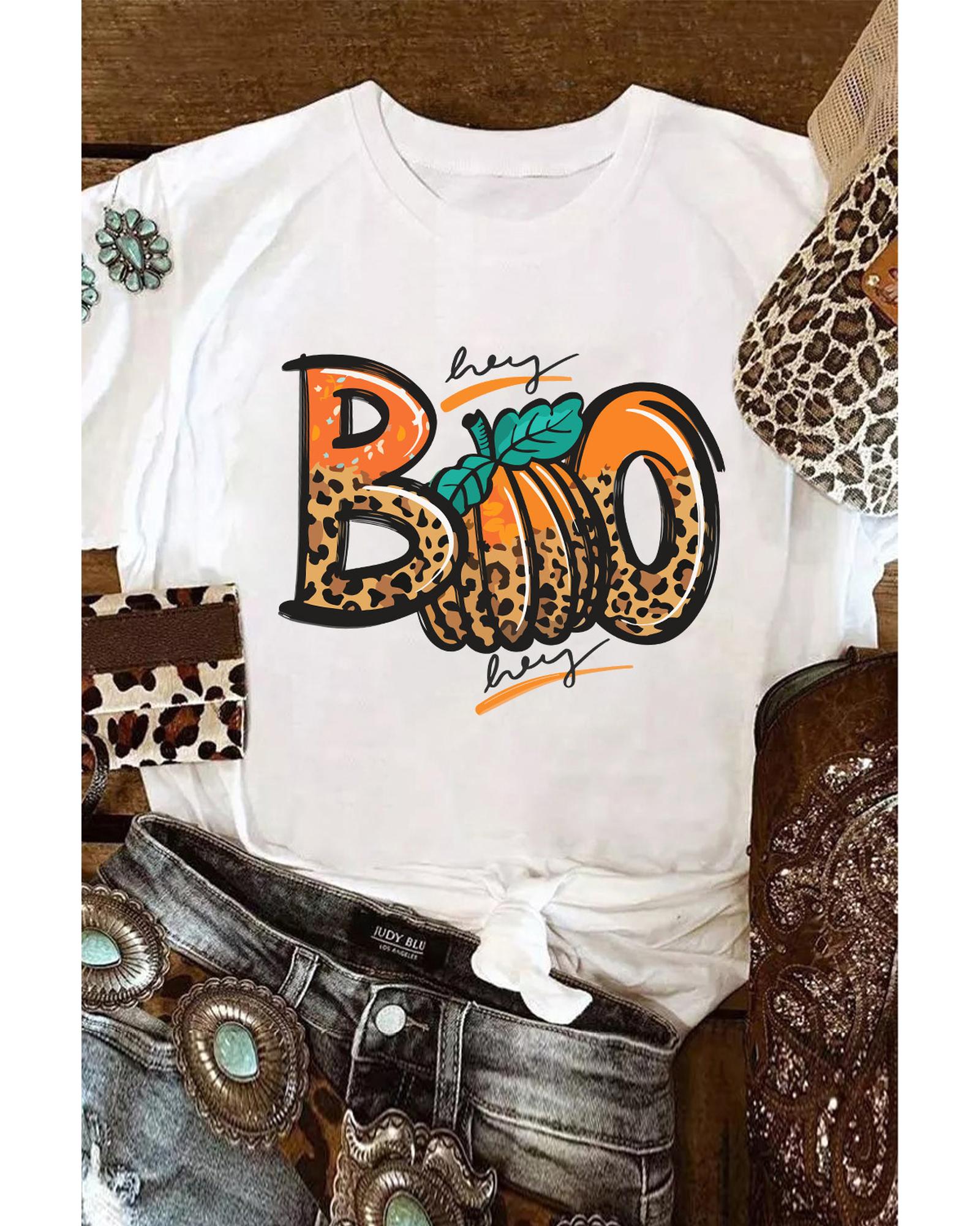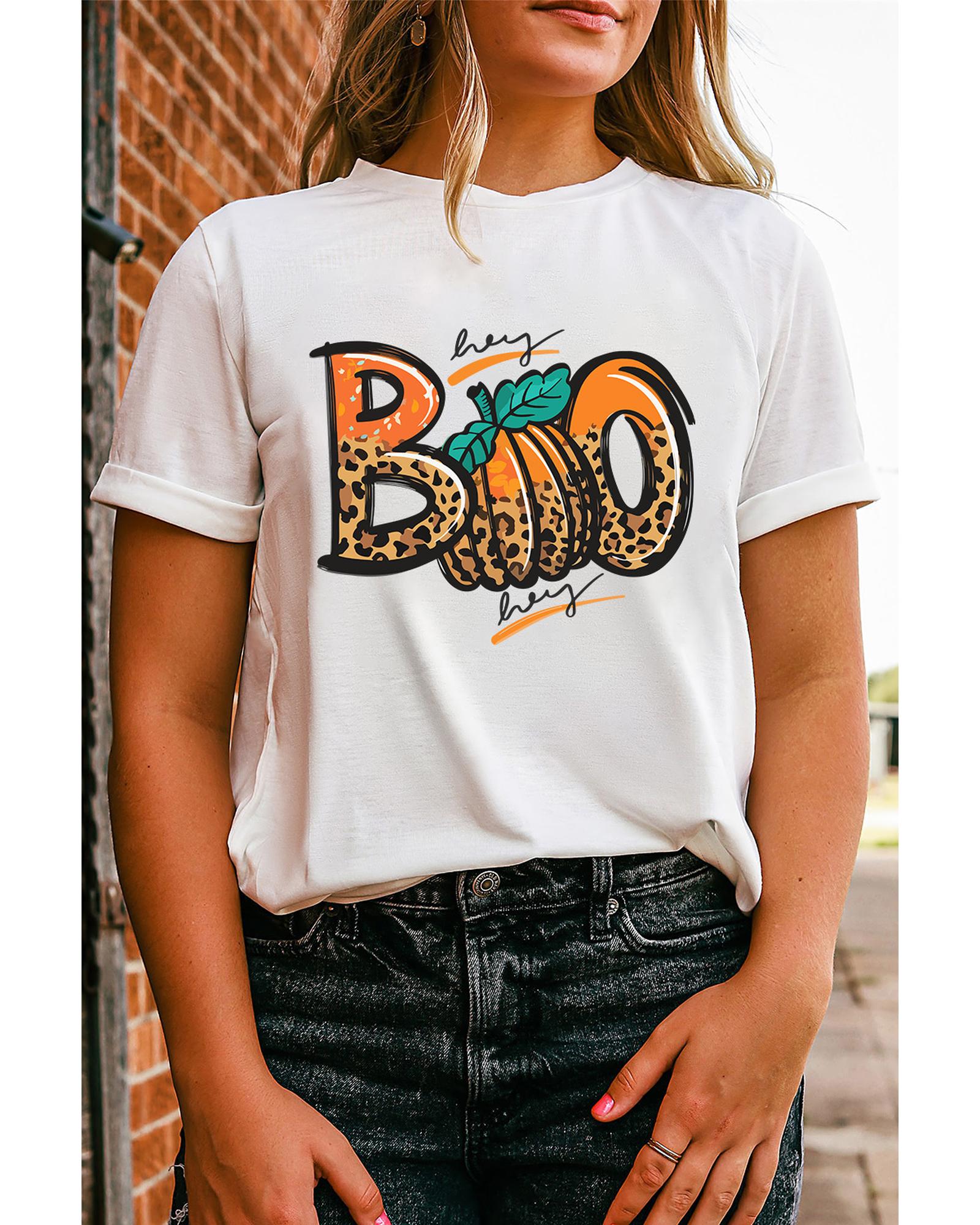 White BOO Pumpkin Leopard Print Crew Neck T Shirt – M