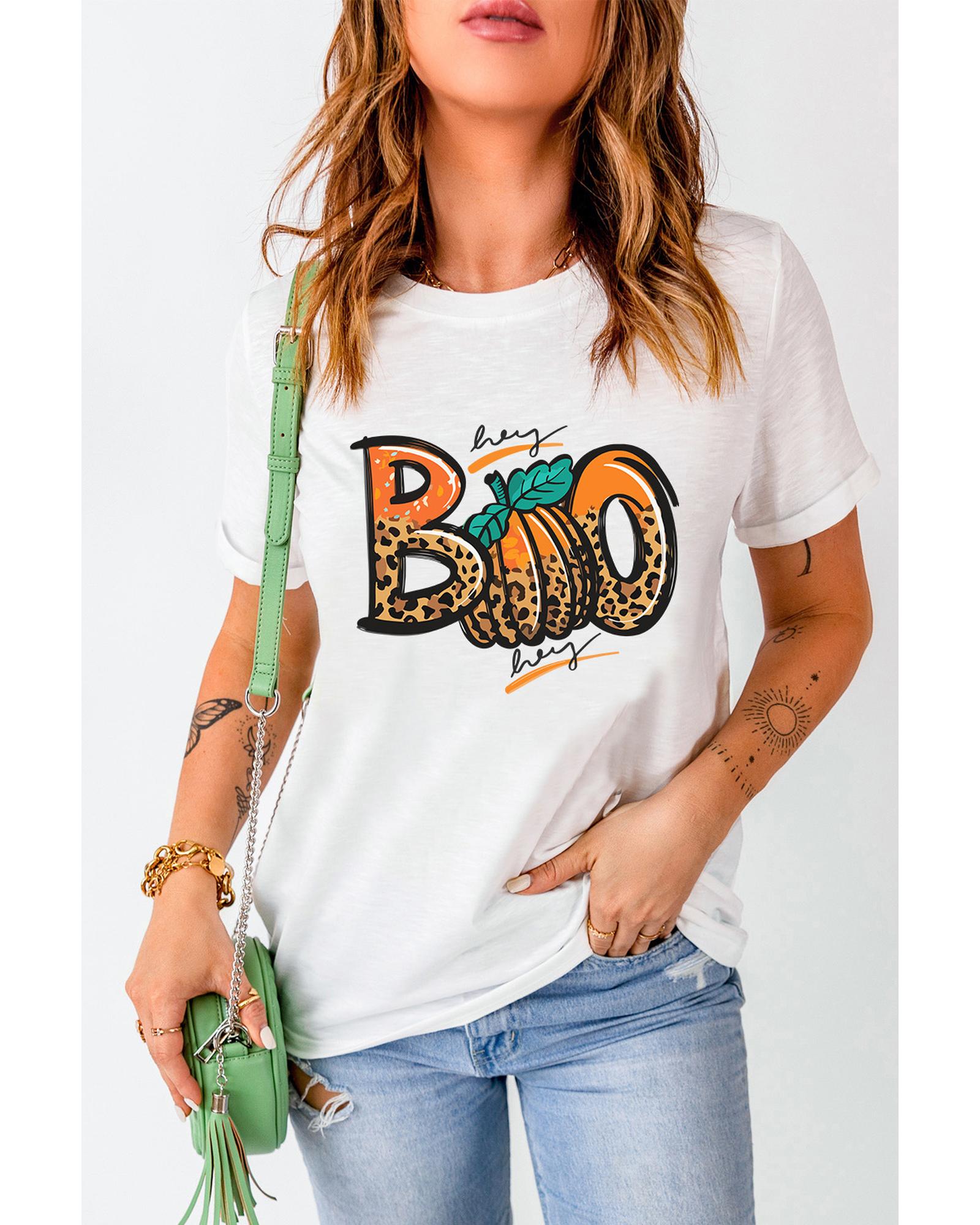 White BOO Pumpkin Leopard Print Crew Neck T Shirt – XL