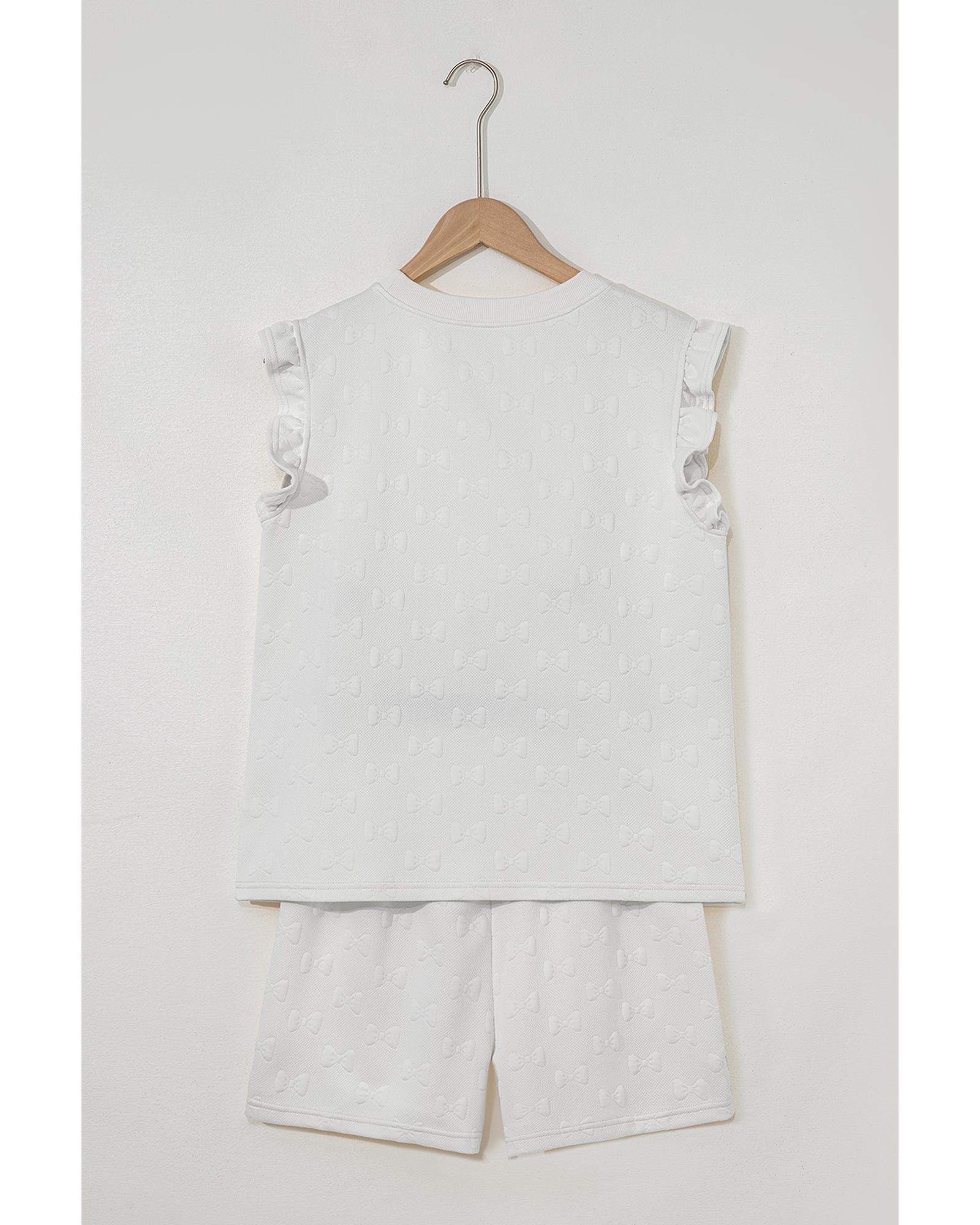 White Bow Jacquard Ruffle Sleeve Short 2pcs Outfit – S
