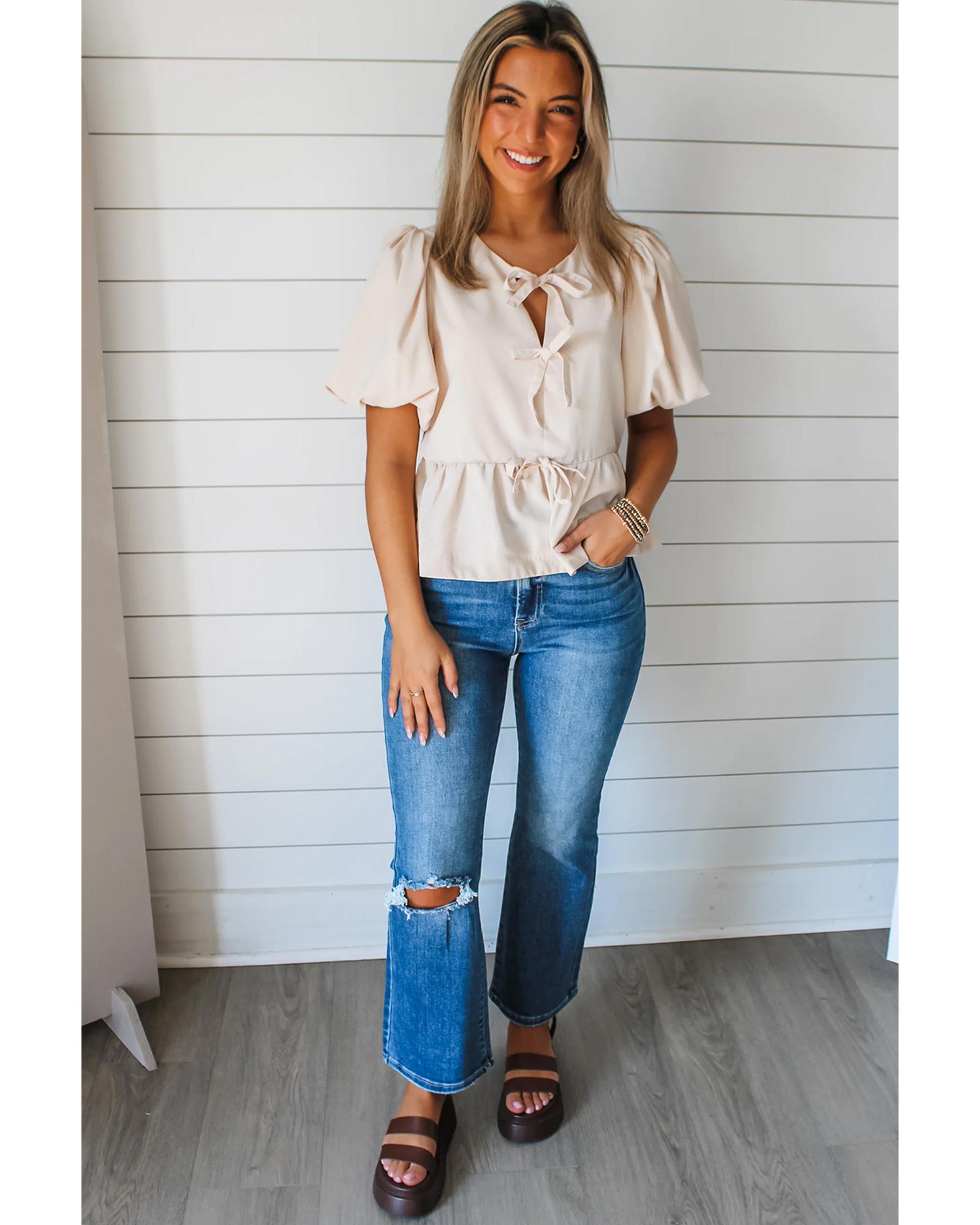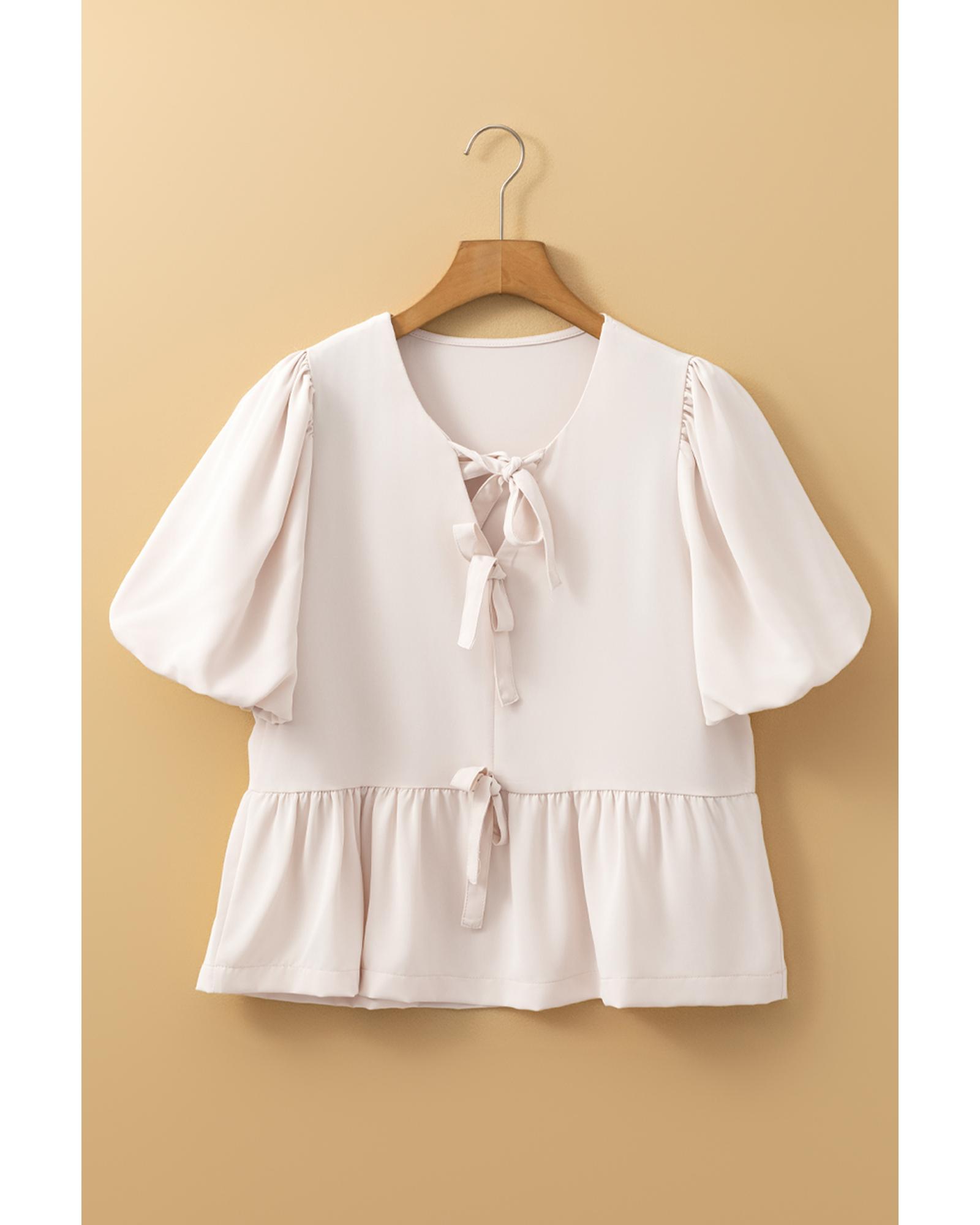 This blouse features a charming design with puff sleeves, a ruffled hem, and delicate bow tie details. It offers a stylish and elegant look suitable for various occasions, whether casual or dressy. The versatile design pairs well with jeans and skirts, making it a great addition to any wardrobe.
