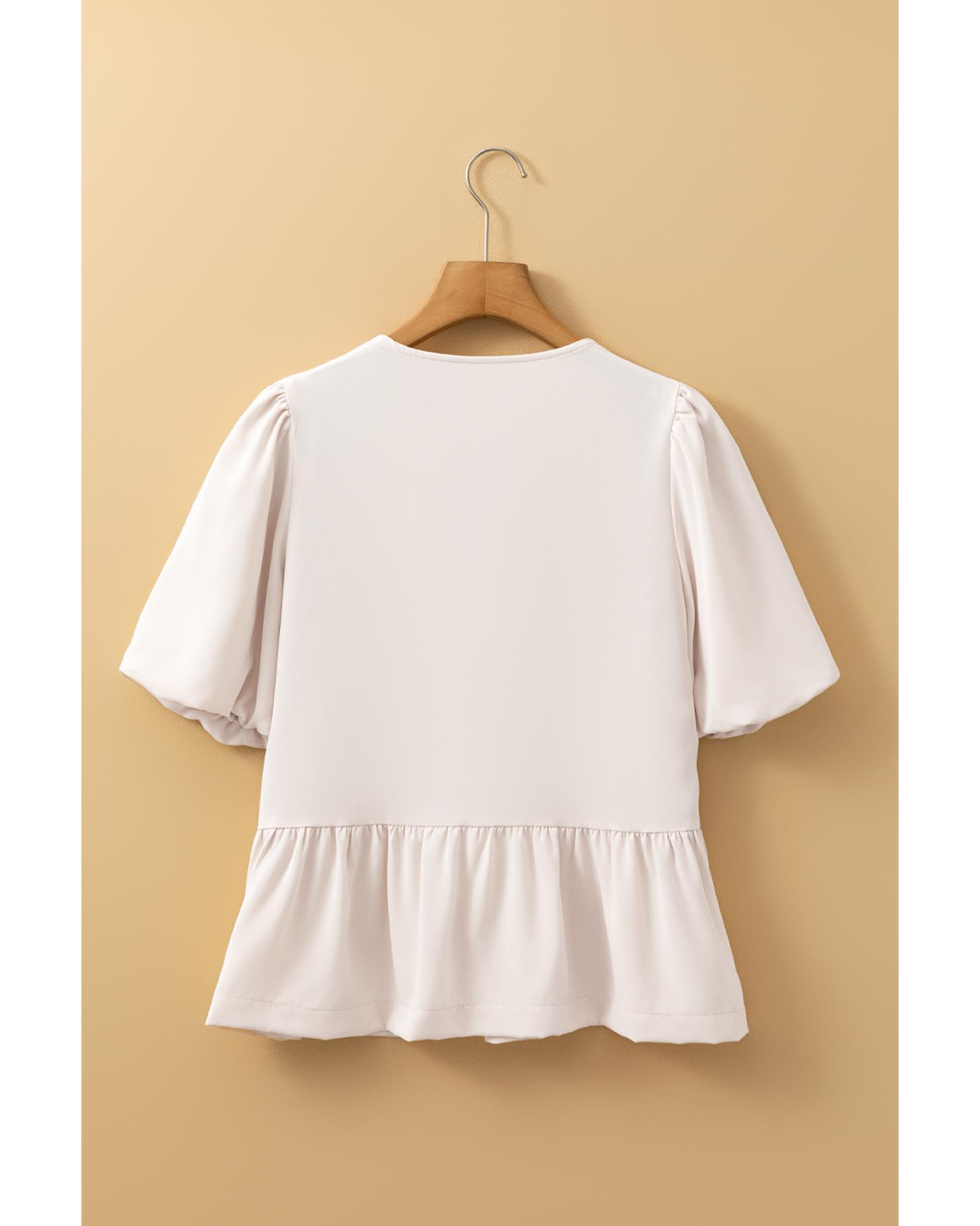 White Bow Tie Short Puff Sleeve Ruffle Hem Blouse – L