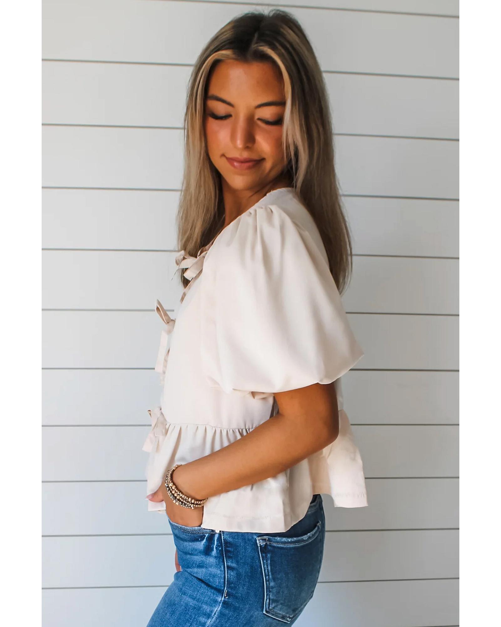 This blouse features a charming design with puff sleeves, a delicate bow tie detail, and a ruffled hem, making it suitable for both casual and dressy occasions. Its versatile style pairs well with jeans and skirts, offering a stylish and elegant look.