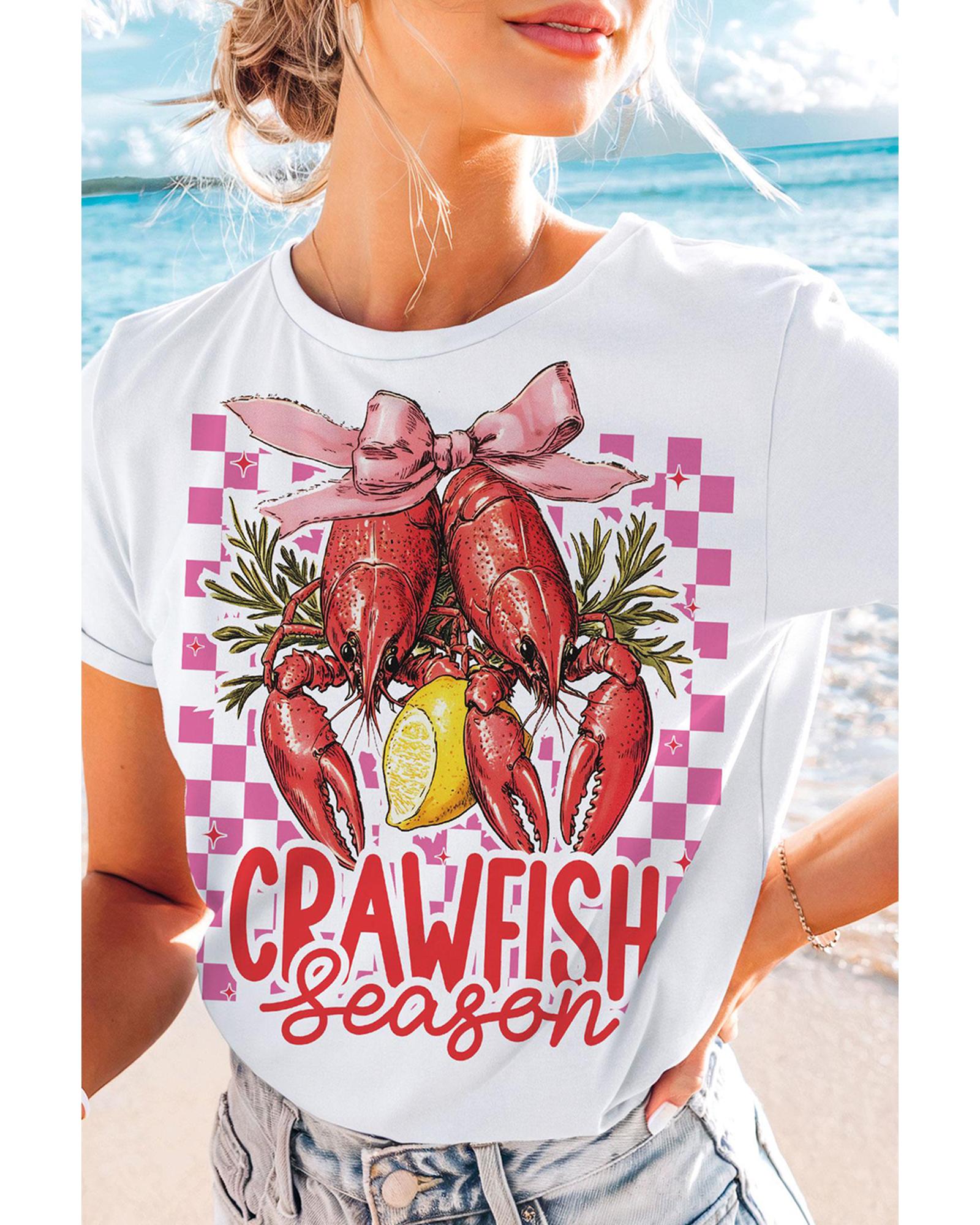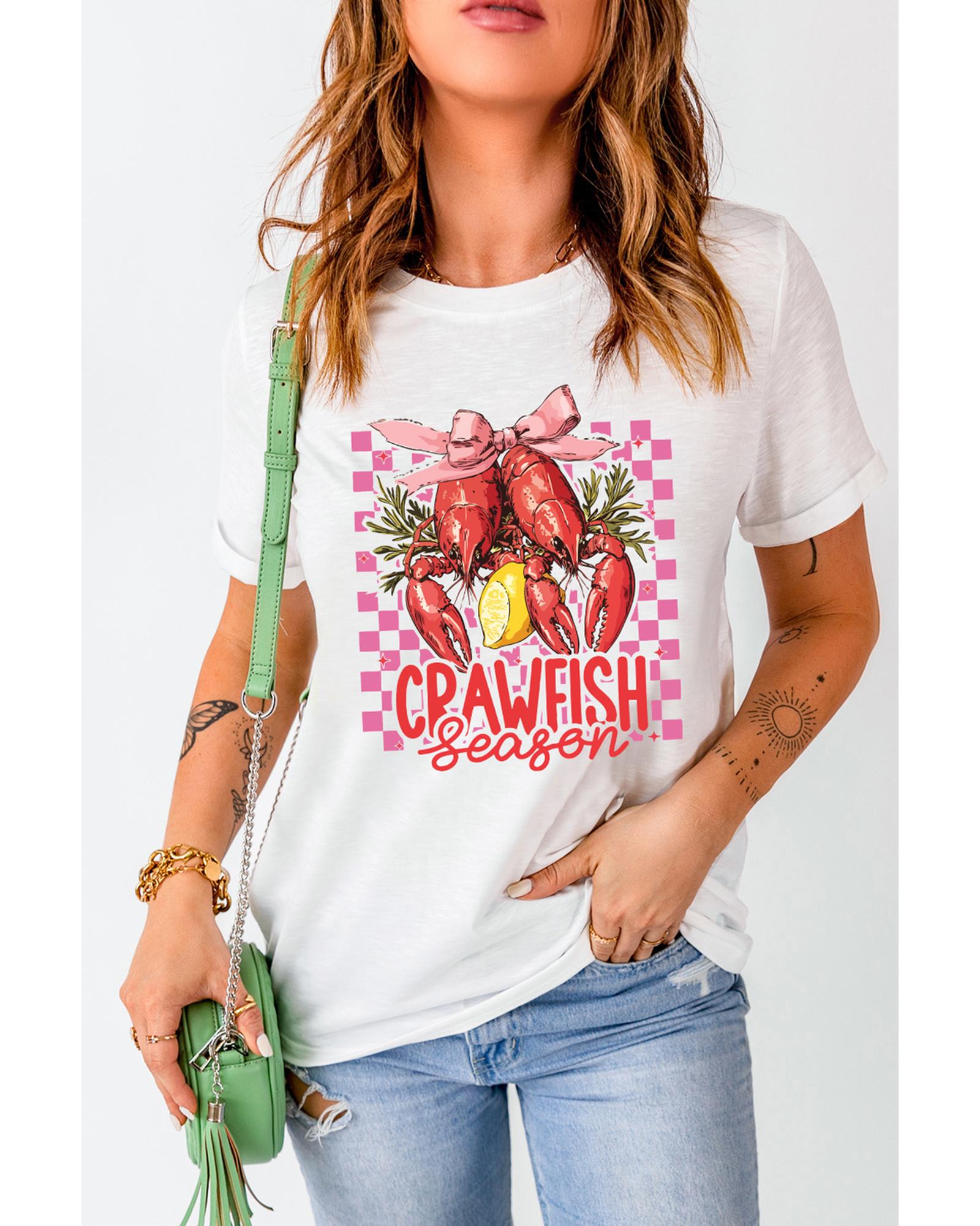 This casual crewneck T-shirt features a distinctive white checkerboard bow design combined with a crawfish season print, making it a stylish and comfortable choice for everyday wear. Its versatile design pairs well with jeans or shorts, suitable for various casual occasions.