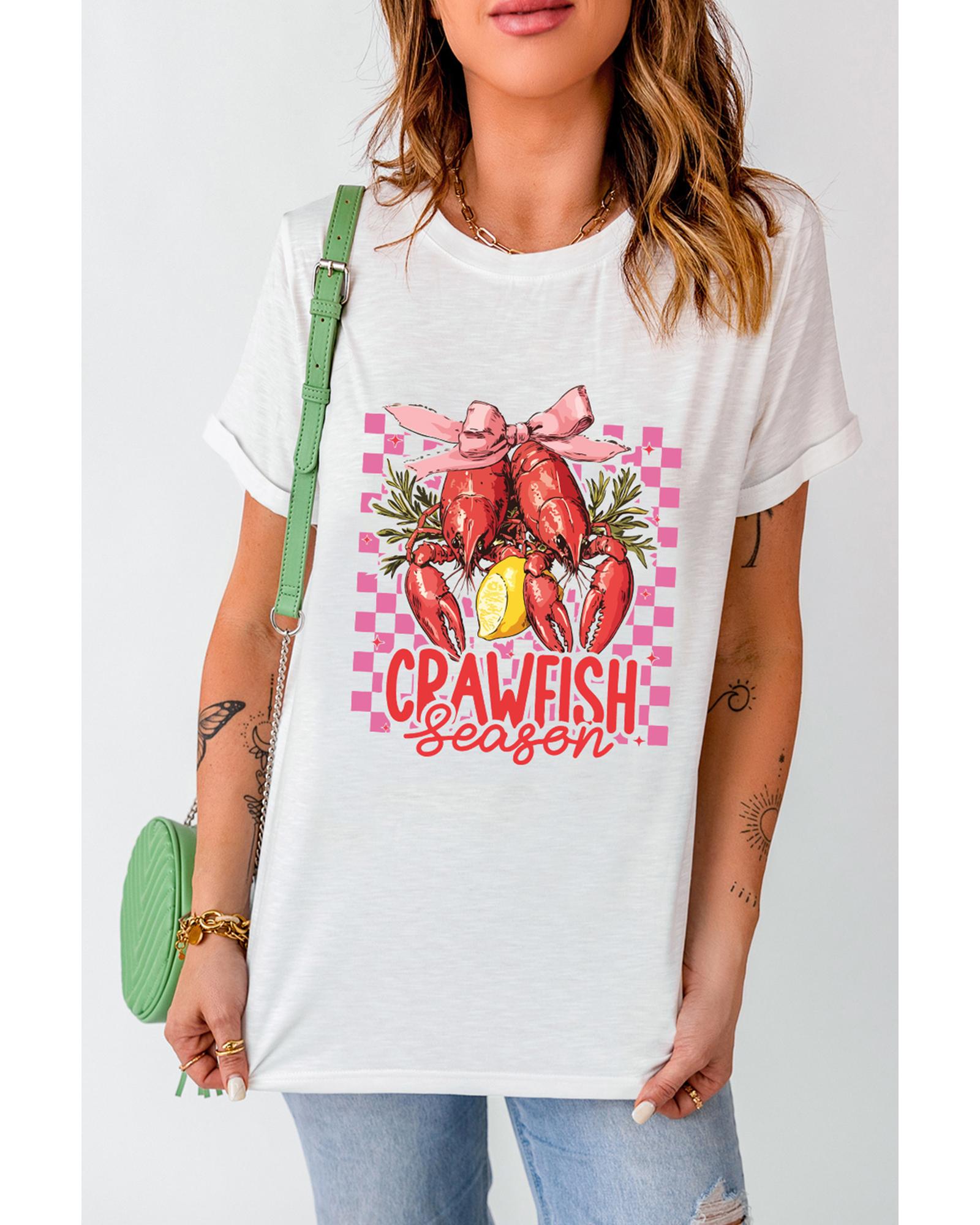 This casual crewneck T-shirt features a distinctive white checkerboard bow design combined with a crawfish season print, making it a stylish choice for everyday wear. Crafted for comfort and style, it pairs well with jeans or shorts for a versatile look.
