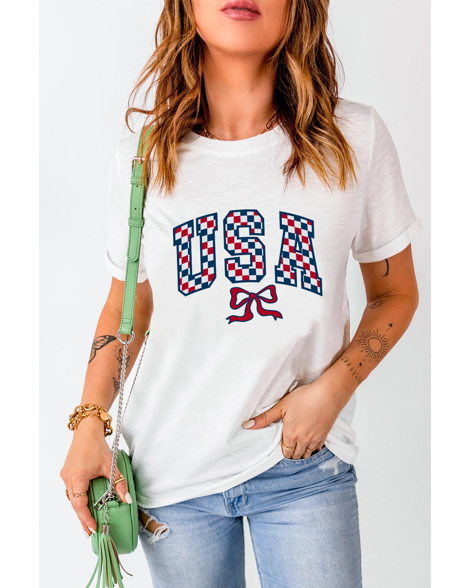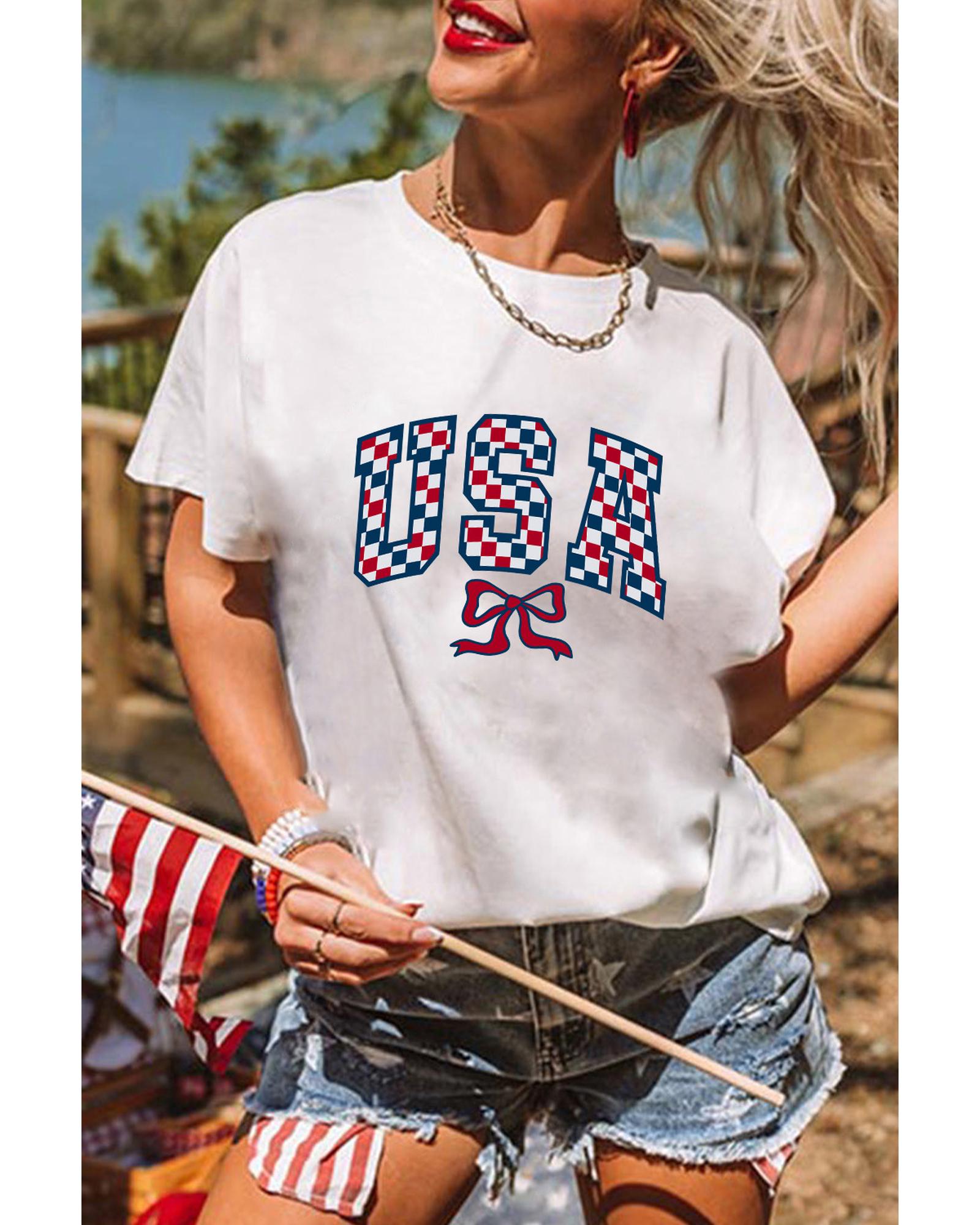 This casual tee features a stylish checkered USA graphic design with bow prints, making it a versatile addition to your wardrobe. Crafted from a soft and breathable cotton blend fabric, it offers comfort for everyday wear. The shift fit provides a relaxed silhouette suitable for casual outings or relaxed weekends. It pairs well with jeans or denim shorts for a laid-back look.