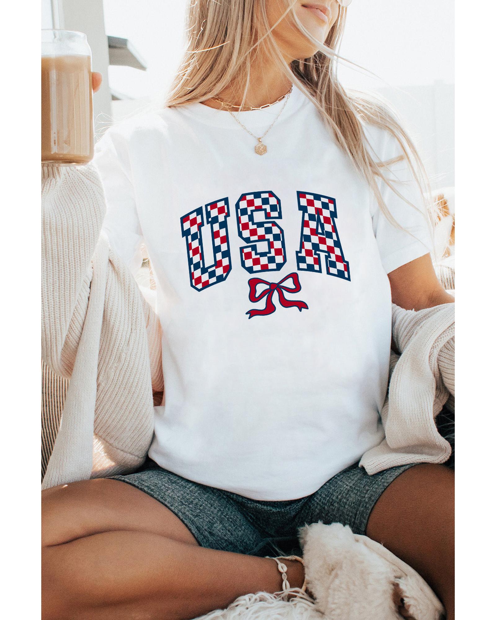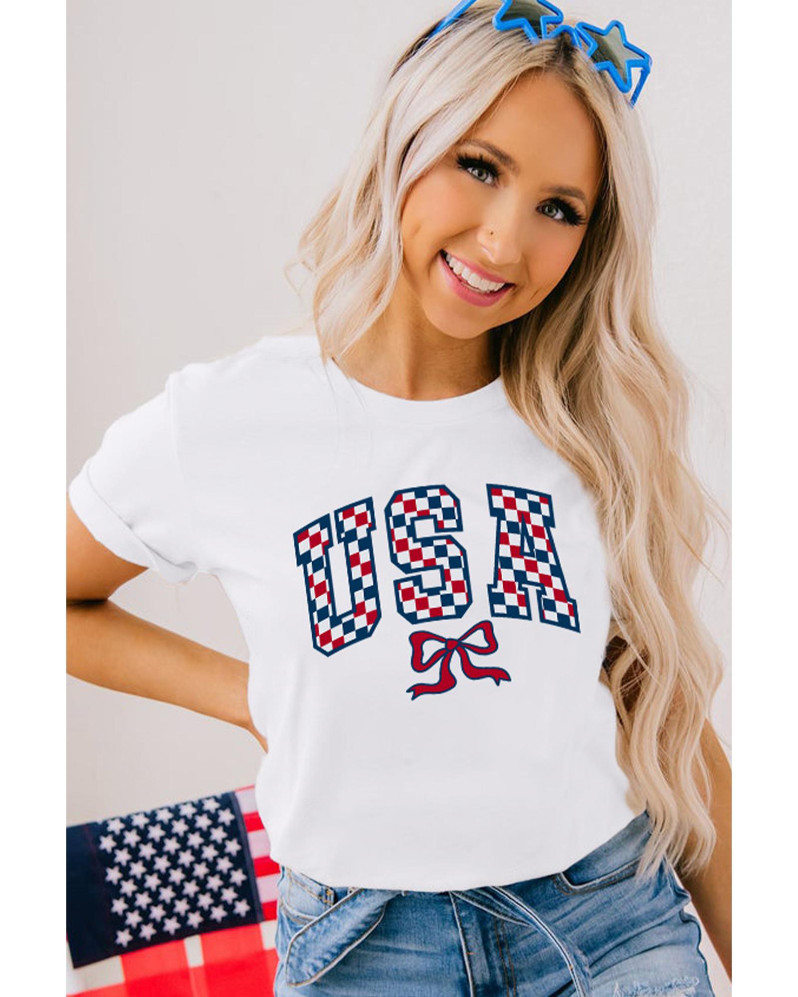 This casual tee features a stylish checkered USA graphic and bow prints, making it a versatile addition to your wardrobe. Crafted from a soft and breathable cotton blend fabric, it offers comfort for everyday wear. The shift fit design is ideal for casual outings or relaxed weekends, and it pairs well with jeans or denim shorts.