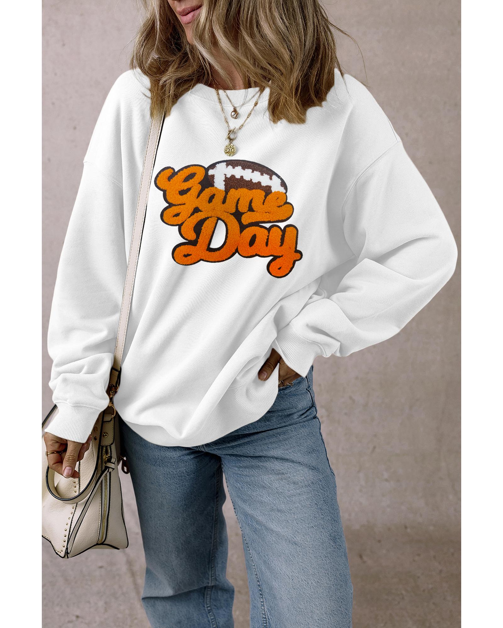 White Chenille Game Day Rugby Football Pattern Pullover Sweatshirt – S