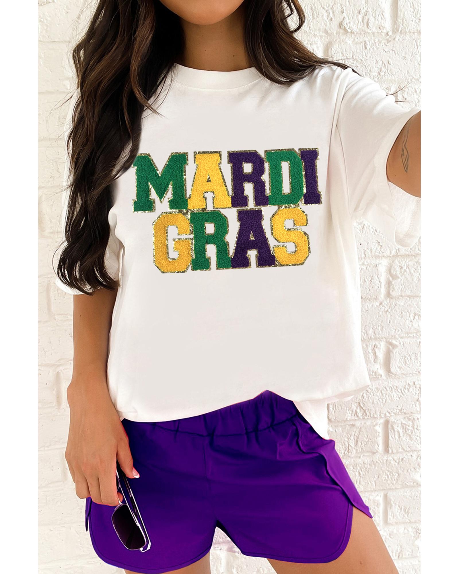 This stylish T-shirt features a textured chenille Mardi Gras patch with glittering trim, offering a trendy and versatile look. Designed with a fitted silhouette, it pairs well with pants, leggings, or shorts for various casual occasions.