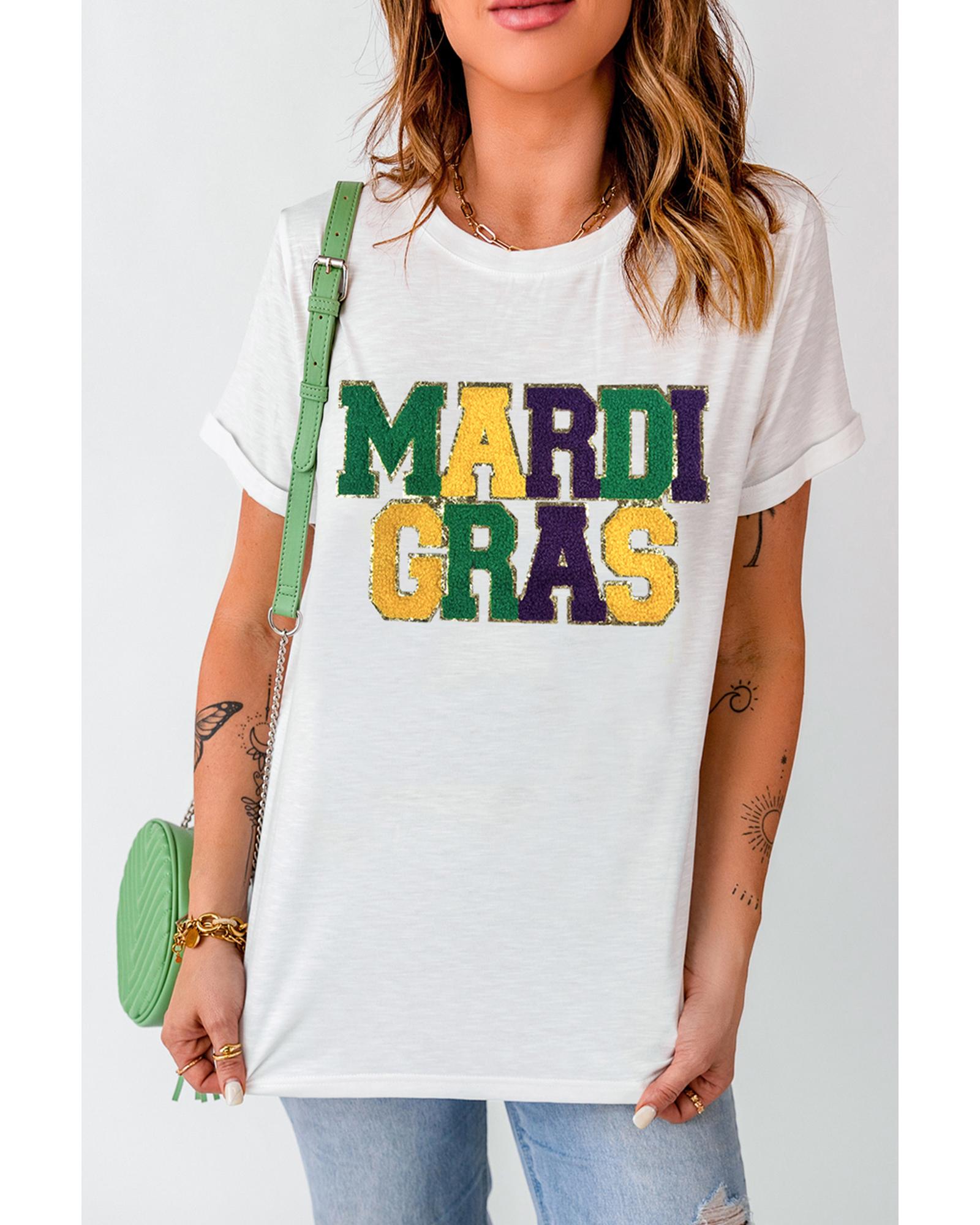 White Chenille MARDI GRAS Patched Graphic T Shirt – XL