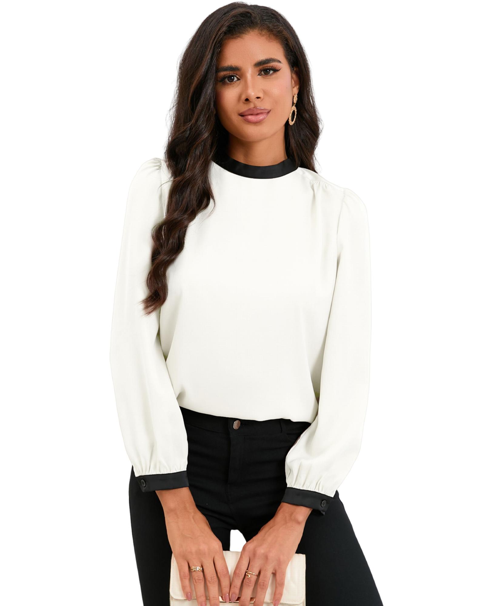 White Color Block Bow Back Mock Neck Blouse – 2XL
