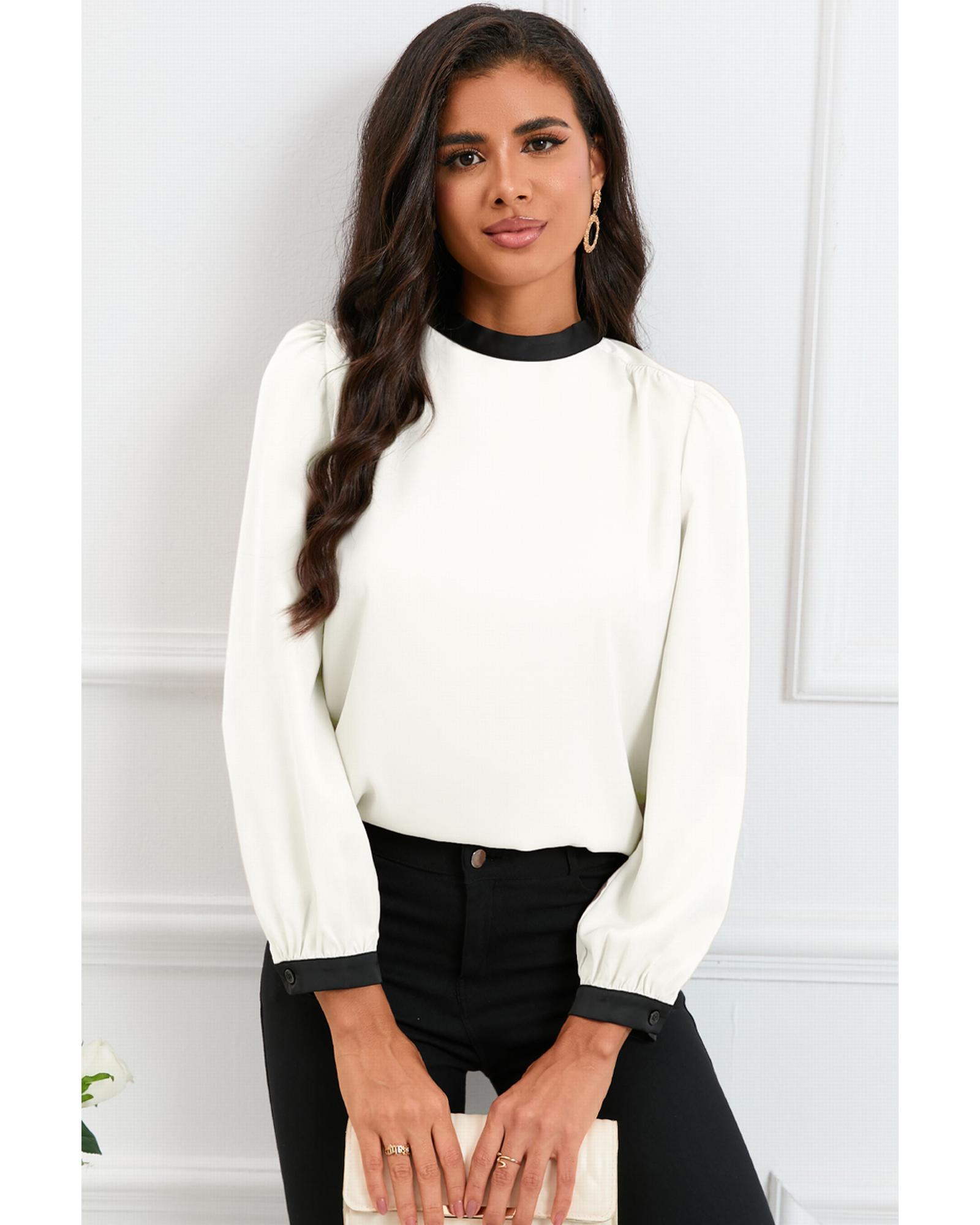 This stylish blouse features a white color block design with a bow back detail, offering a trendy and versatile look. The mock neck adds a touch of elegance, making it suitable for various occasions.