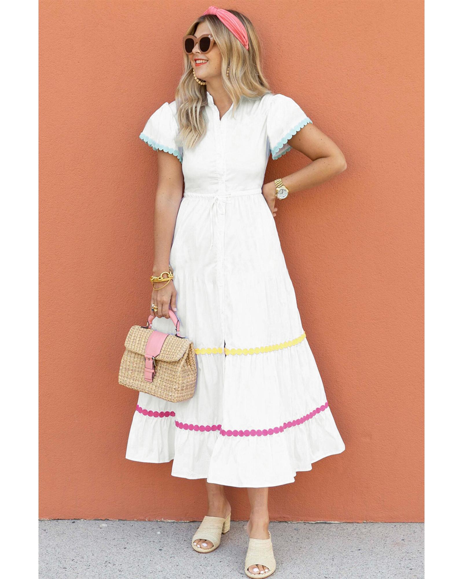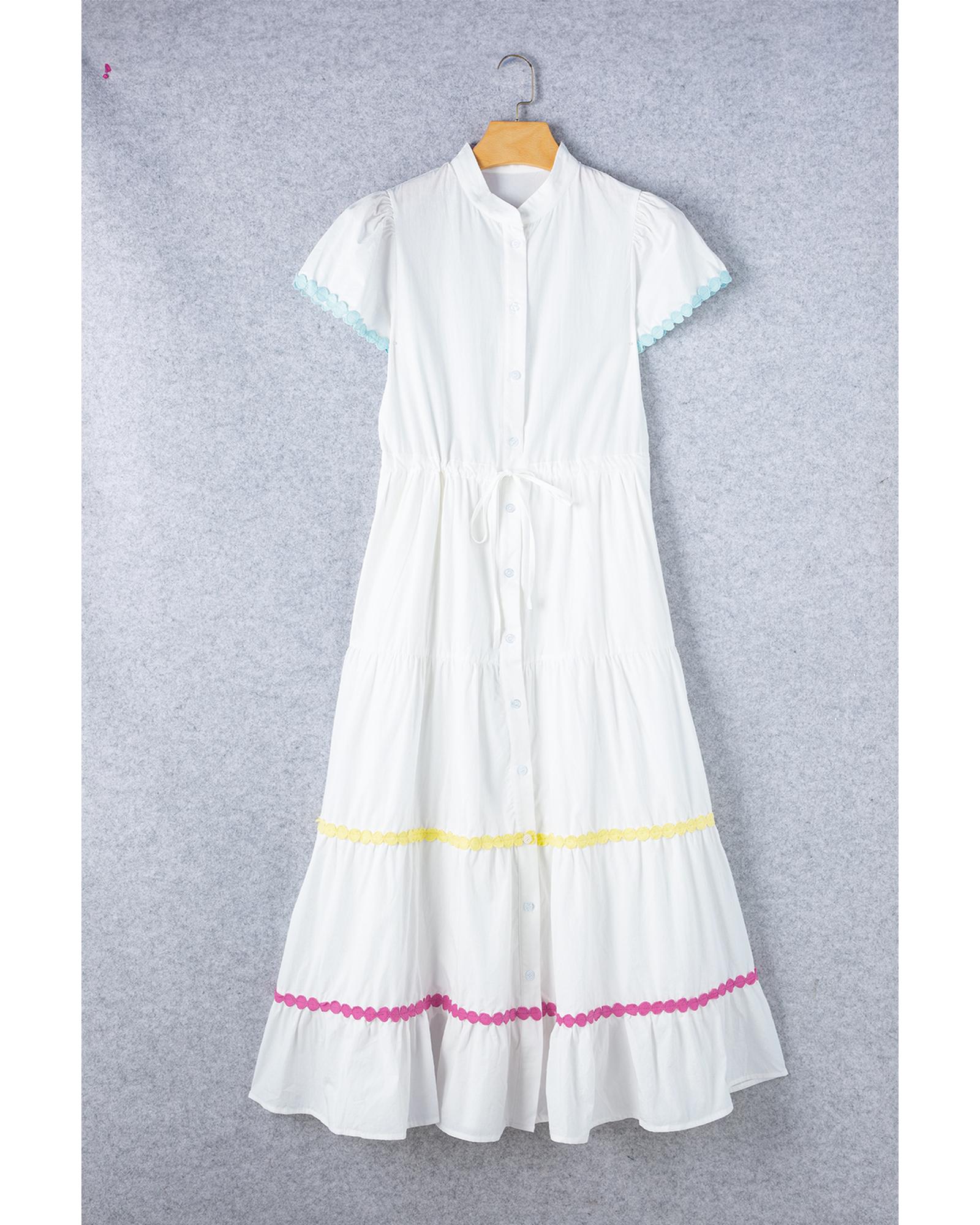 White Colorblock Rickrack Trim Short Sleeve Drawstring Waist Long Dress – S