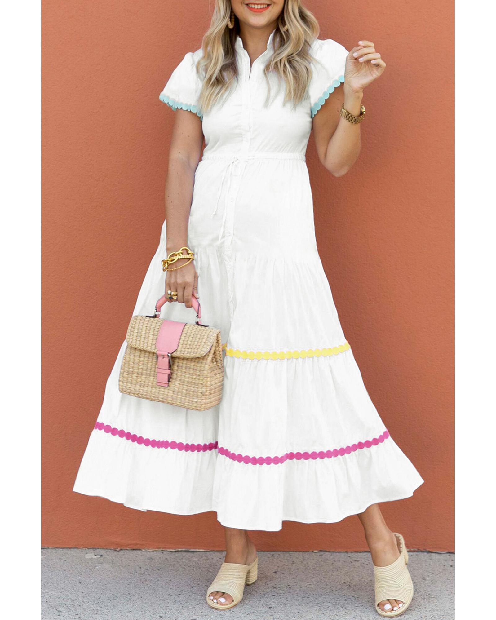 White Colorblock Rickrack Trim Short Sleeve Drawstring Waist Long Dress – XL