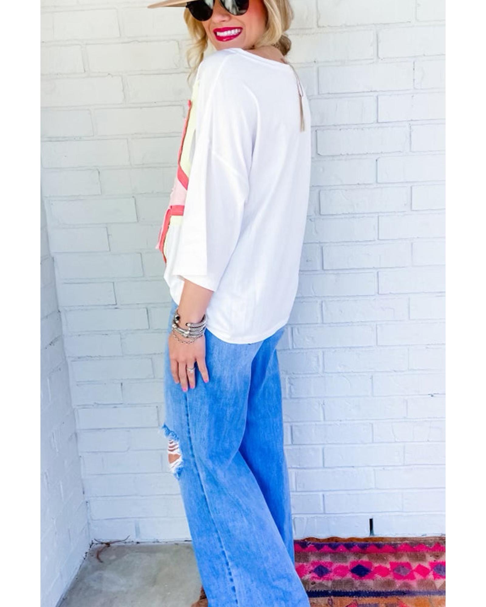White Colorblock Star Patched Half Sleeve Oversized Tee – L