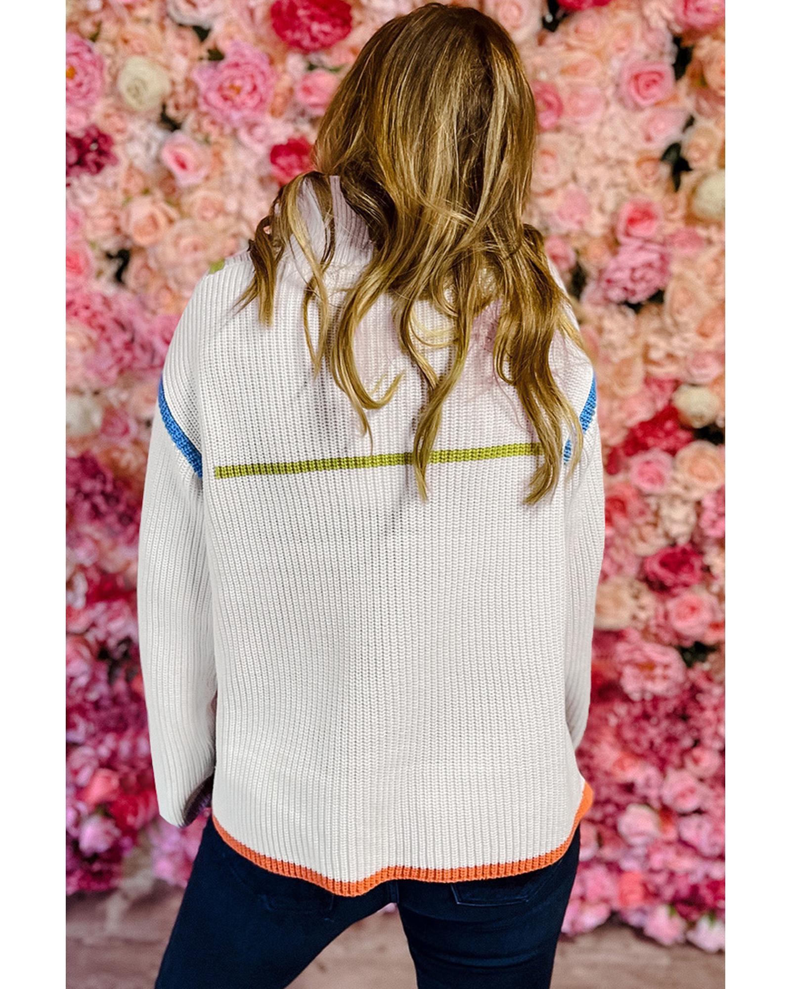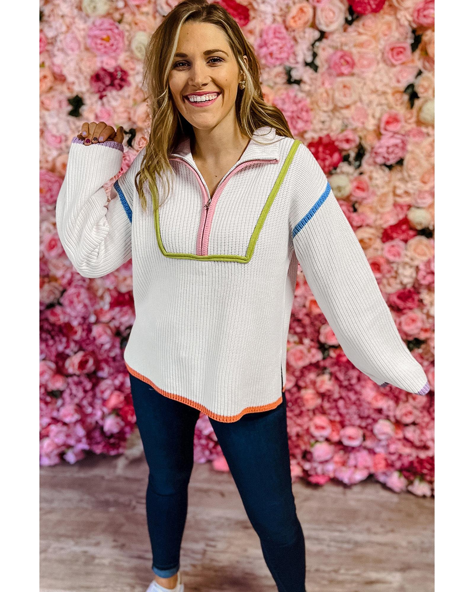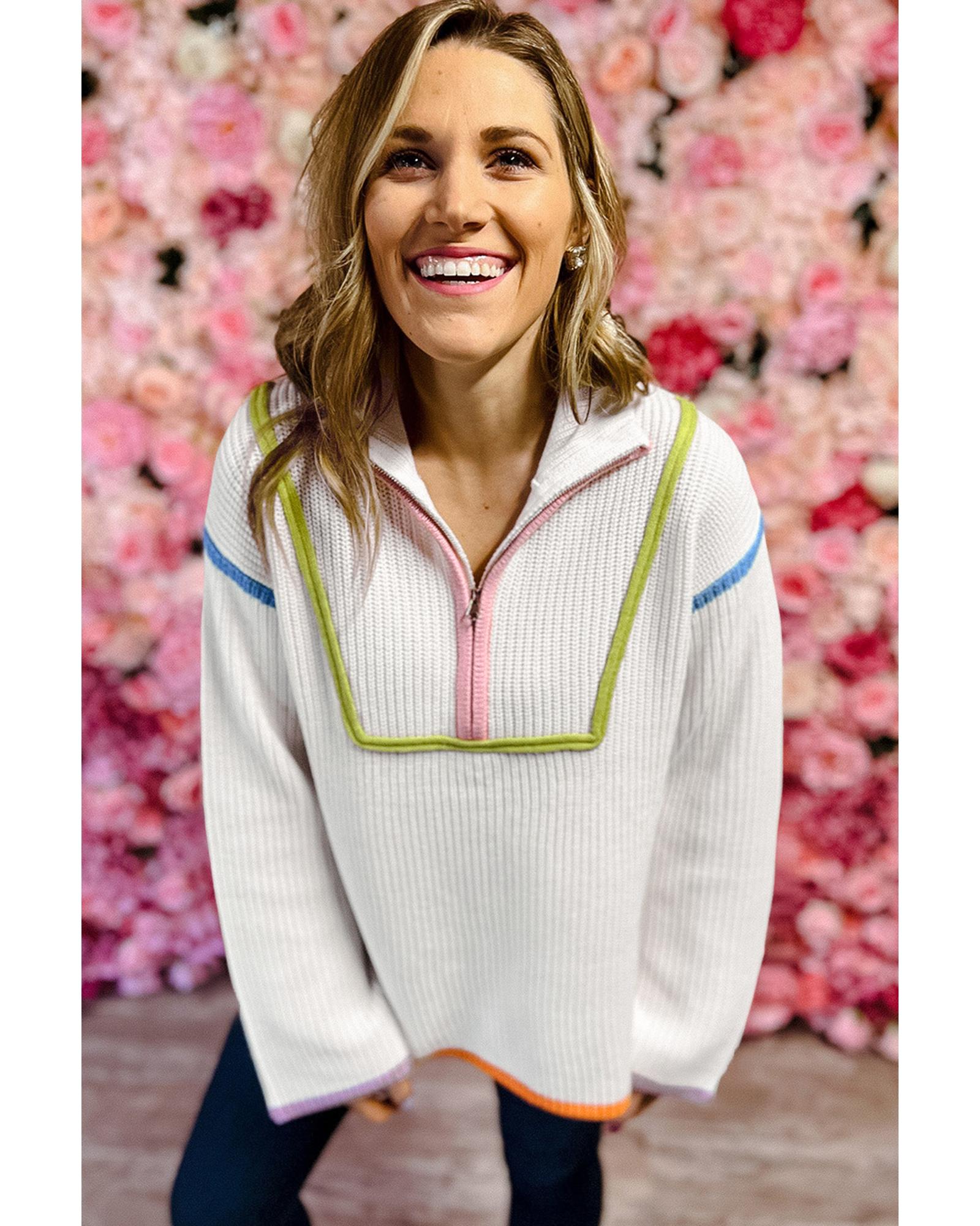 White Colorful Edge Quarter Zip Drop Shoulder Sweater - L Original price was: $74.99.Current price is: $40.99.