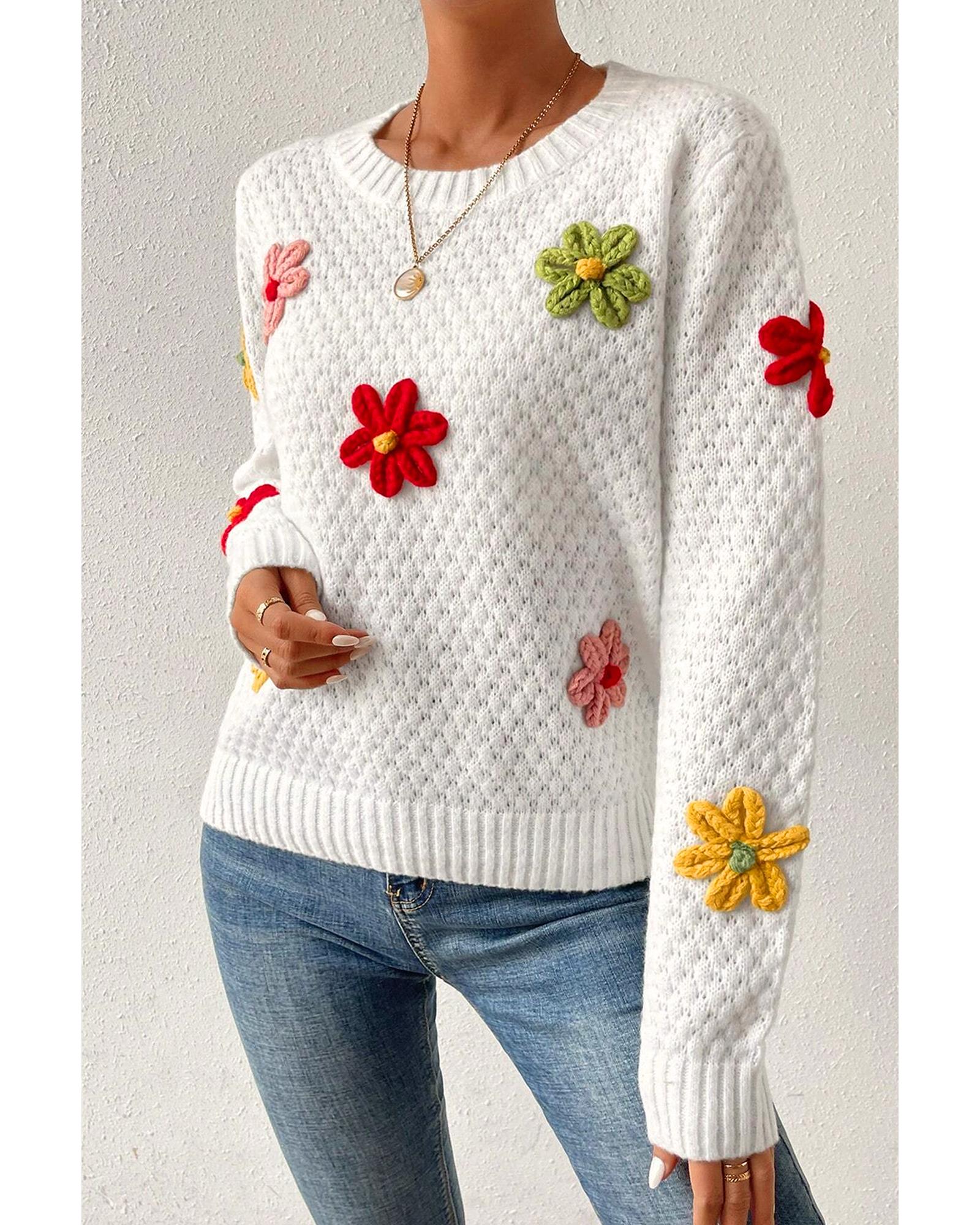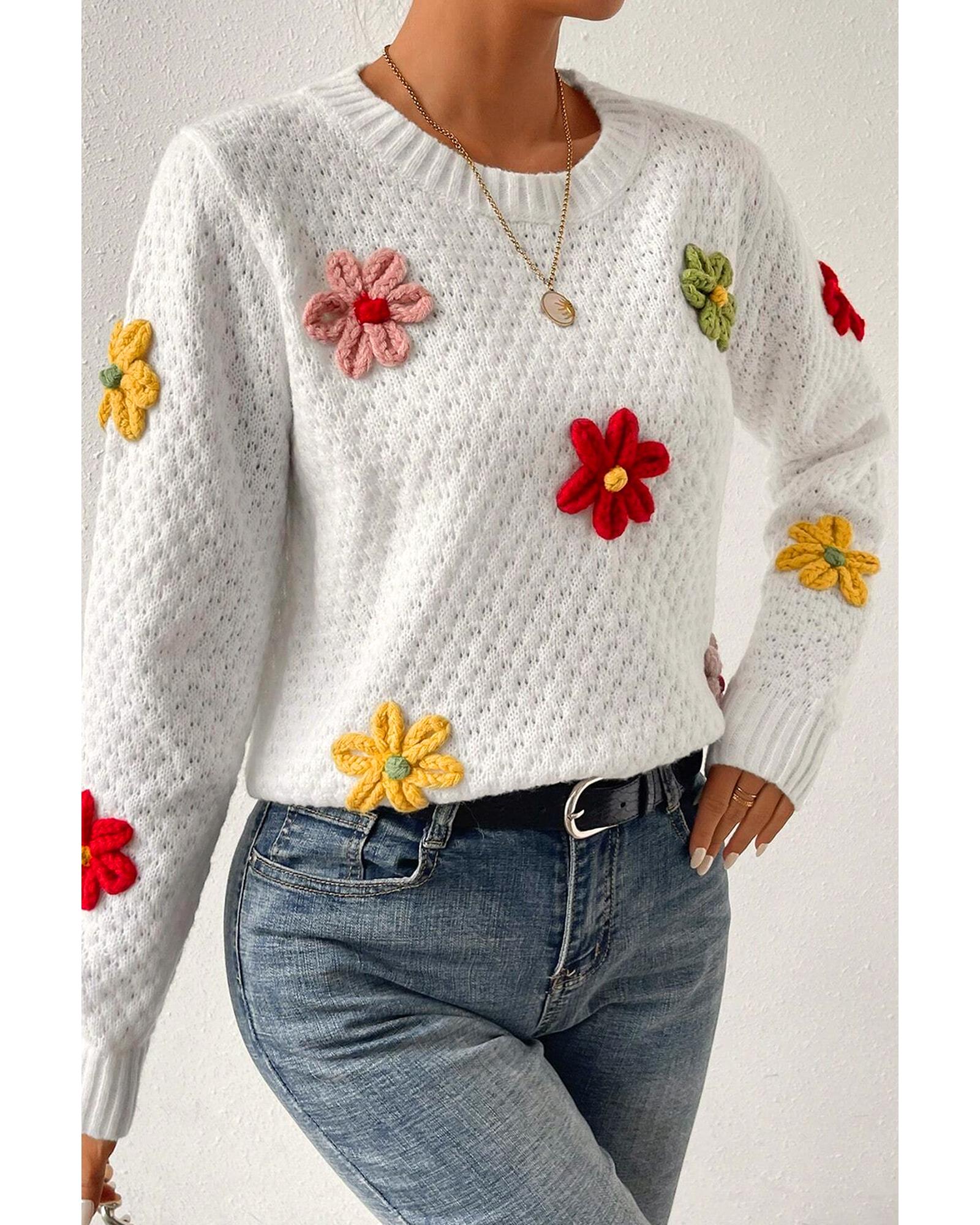 This textured knit sweater features a vibrant white color with colorful flower appliqu?? details, offering a trendy and comfortable style suitable for early fall. Designed with a fitted silhouette, it combines fine quality materials with a soft, warm feel for everyday wear.