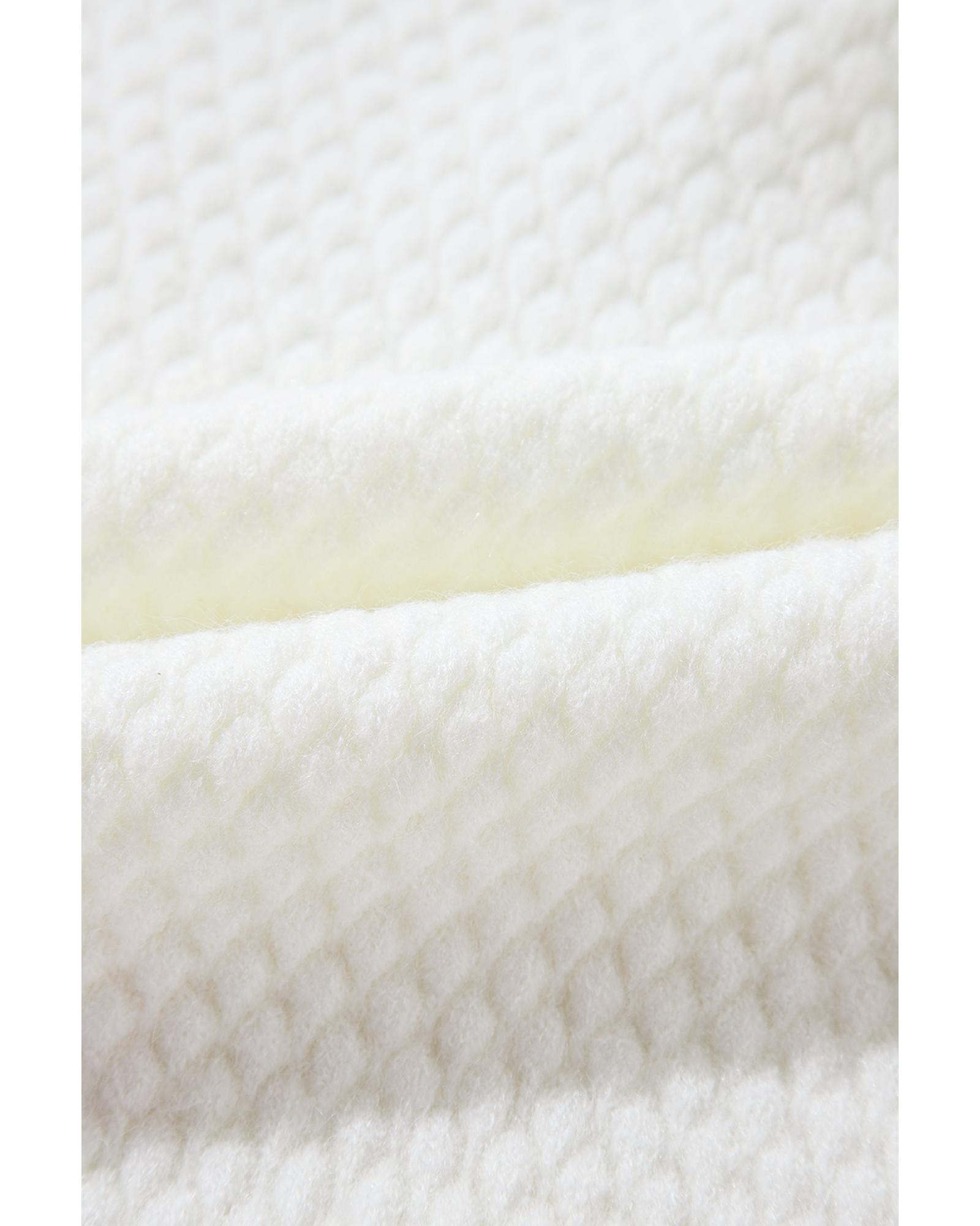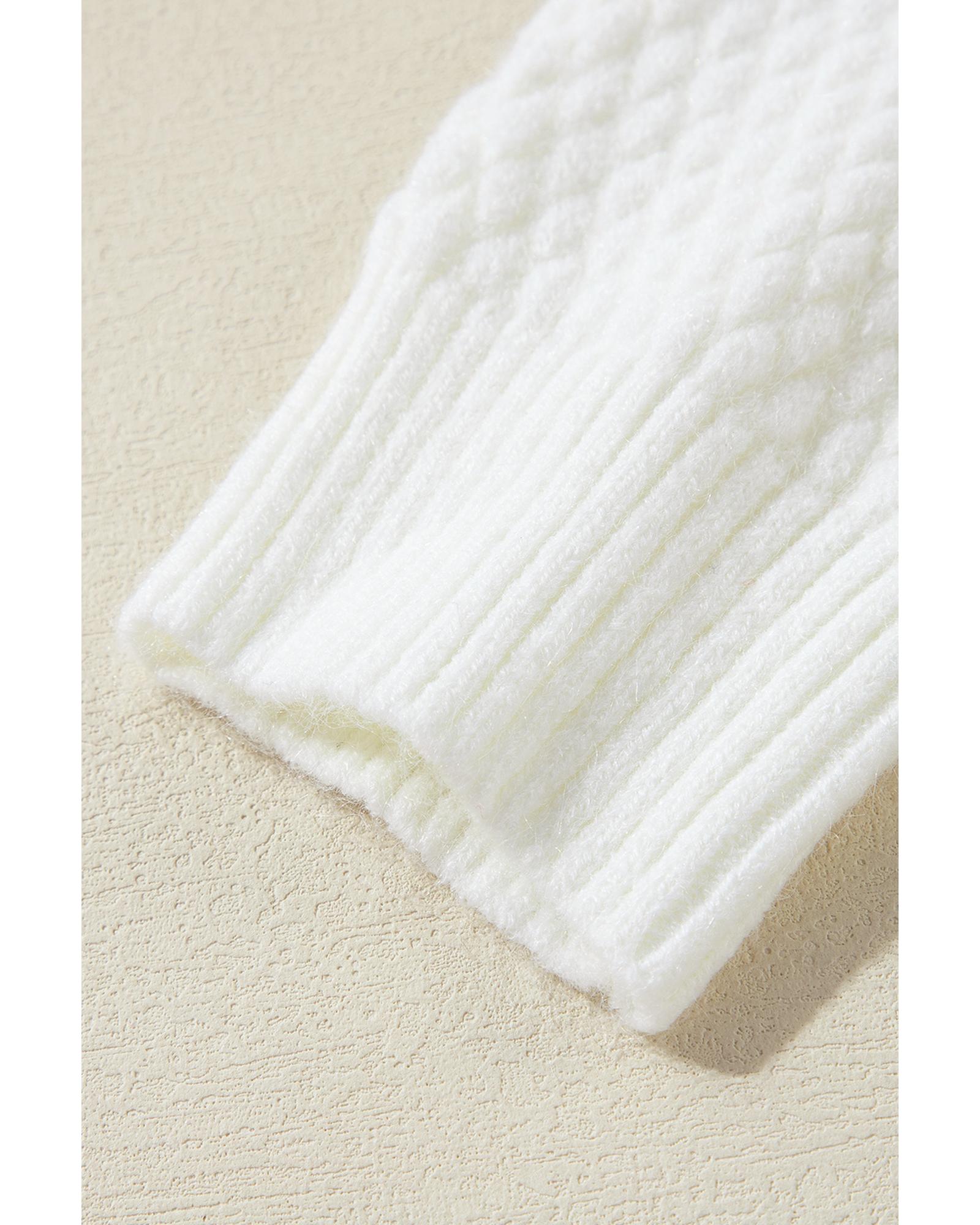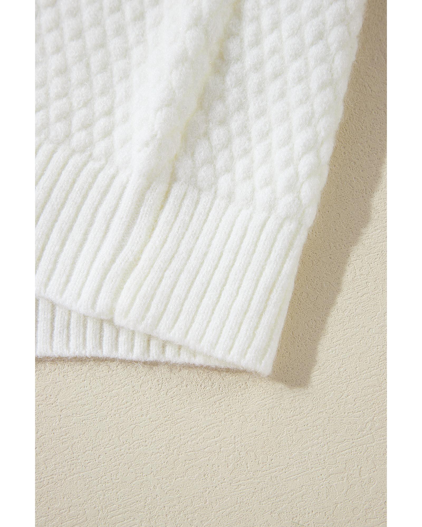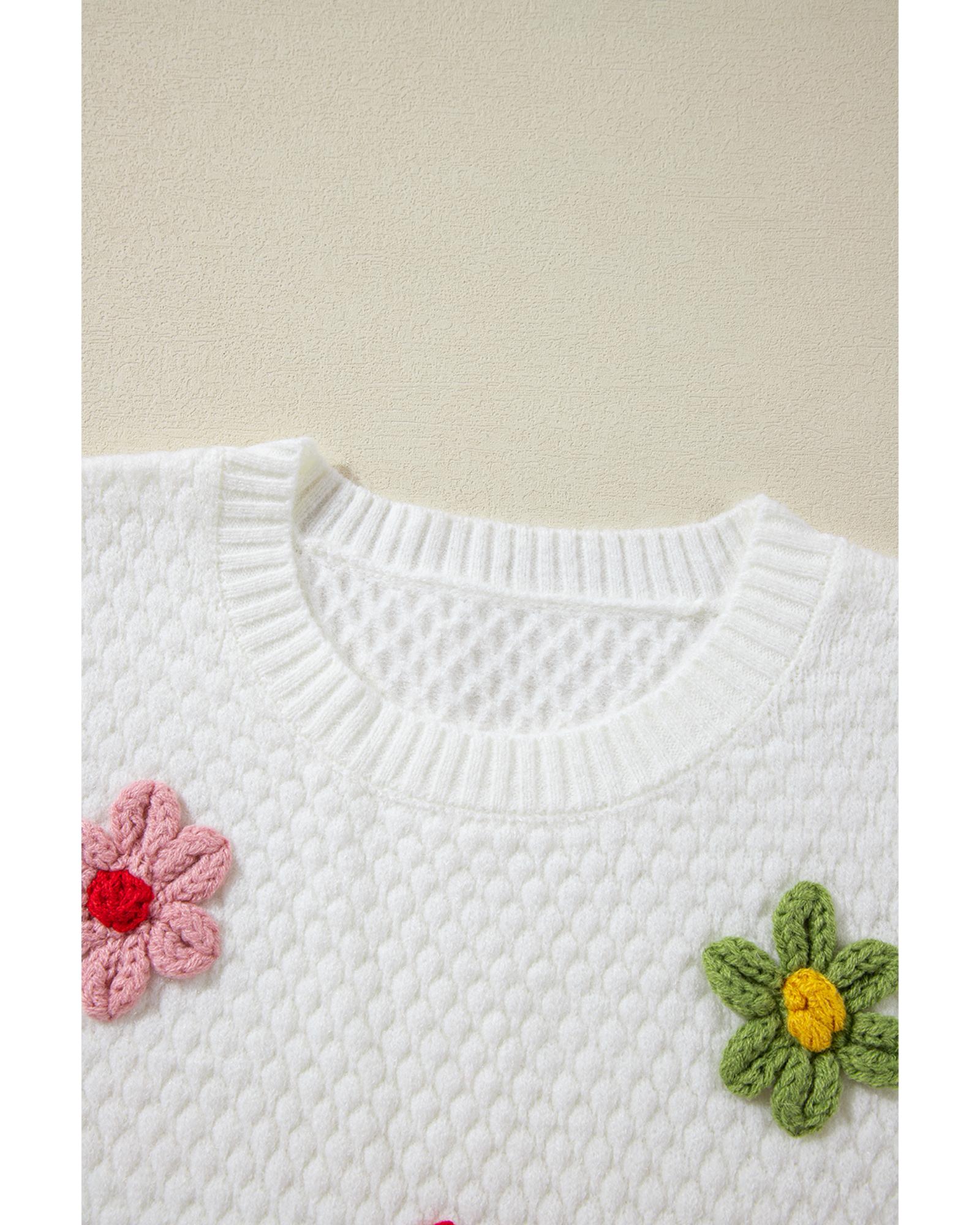 This textured knit sweater features a vibrant white color with colorful flower appliqu?? details, offering a stylish and cozy option for early fall. Designed with a trendy fitted silhouette, it combines comfort and fashion effortlessly.
