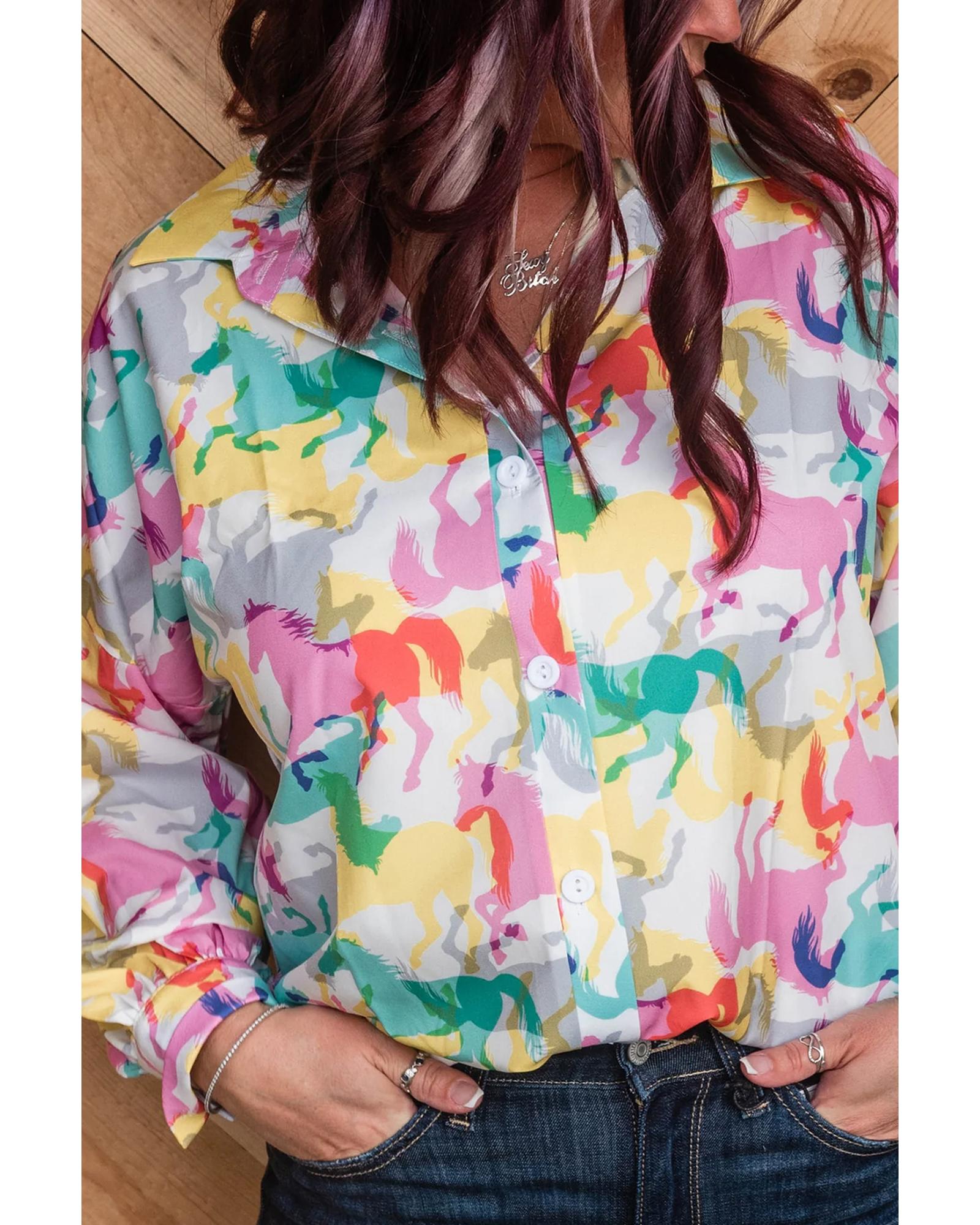 This colorful horse printed long sleeve button-up casual shirt offers a vibrant and playful look with its unique design. It features a classic turn-down collar and front button closure, combining style and ease of wear. Made from high-quality materials, this unisex shirt provides both comfort and warmth, making it suitable for various casual occasions.