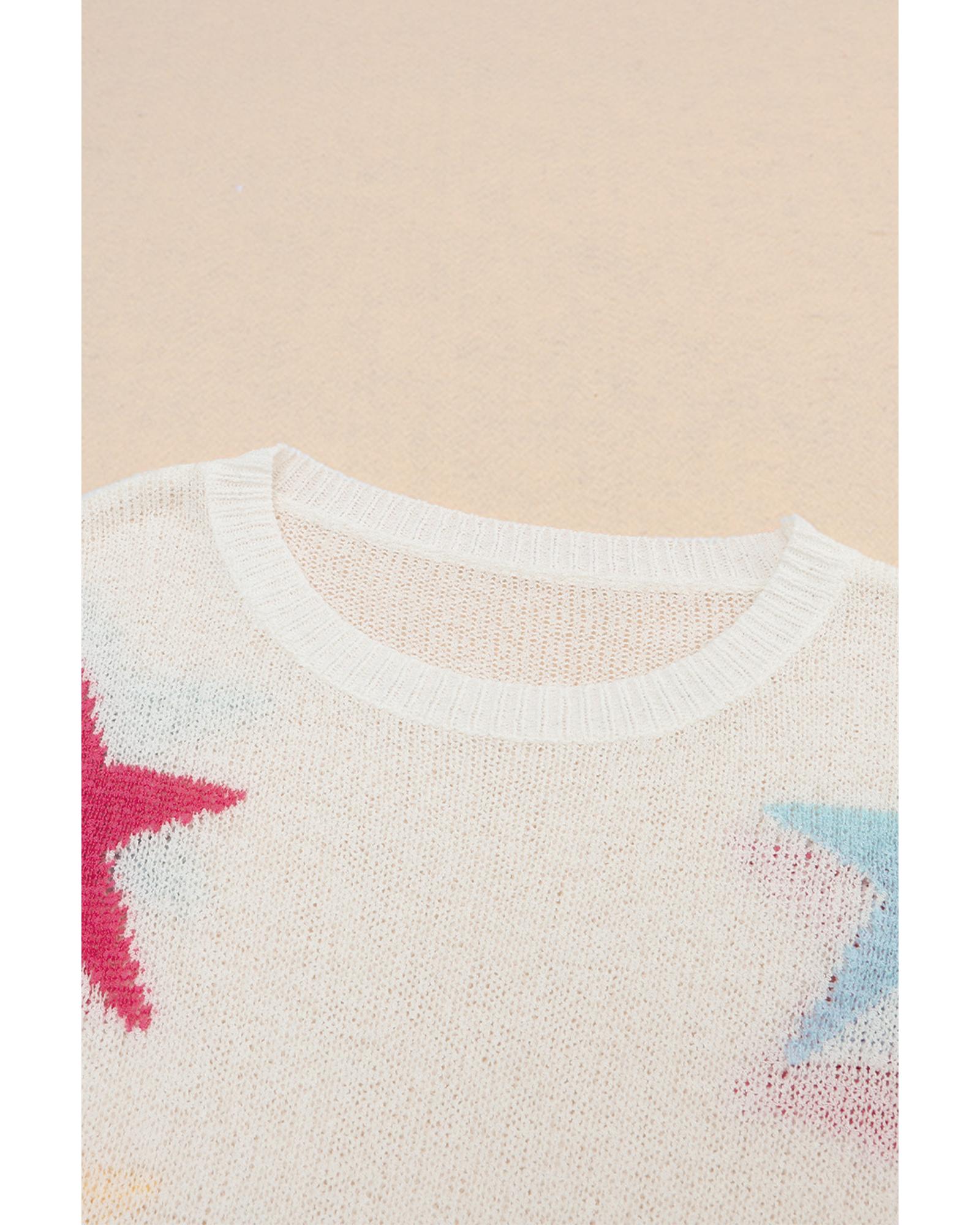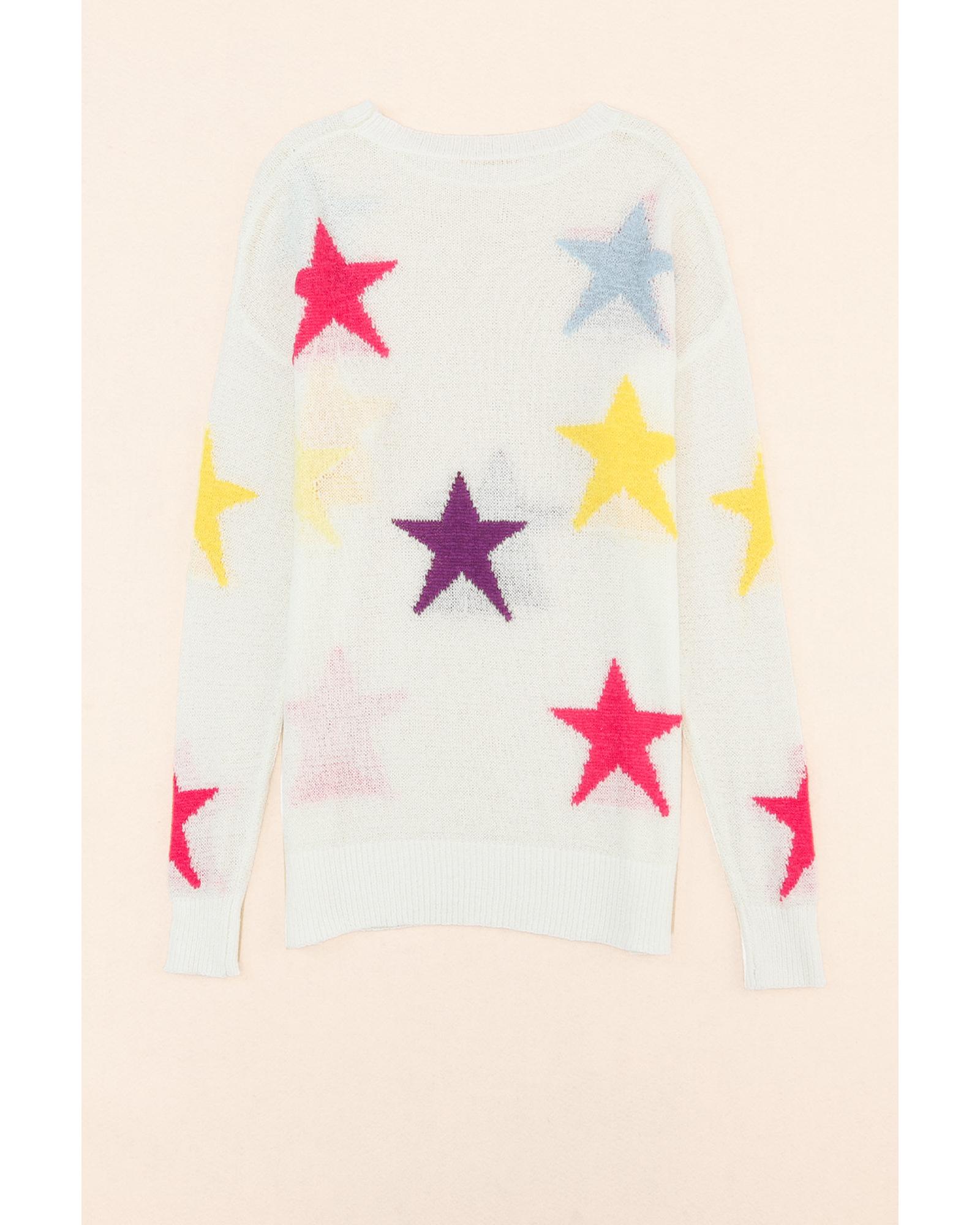 This white colorful star pattern loose sweater combines a trendy fitted look with a comfortable, lightweight design. It features a classic crew neck, drop shoulder, and ribbed hem, making it suitable for spring, fall, and winter seasons. The sweater is designed to provide a stylish yet relaxed fit, perfect for casual wear.
