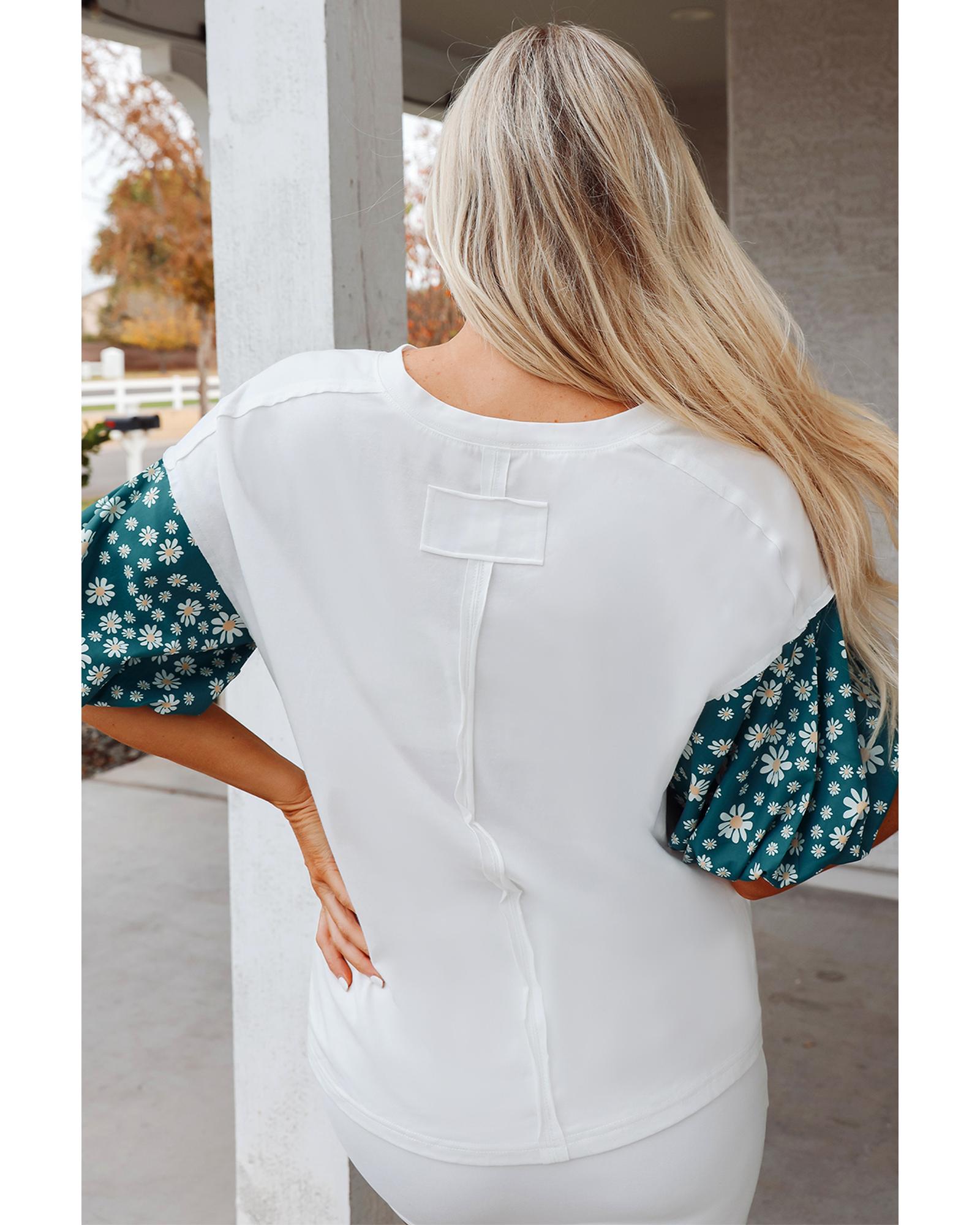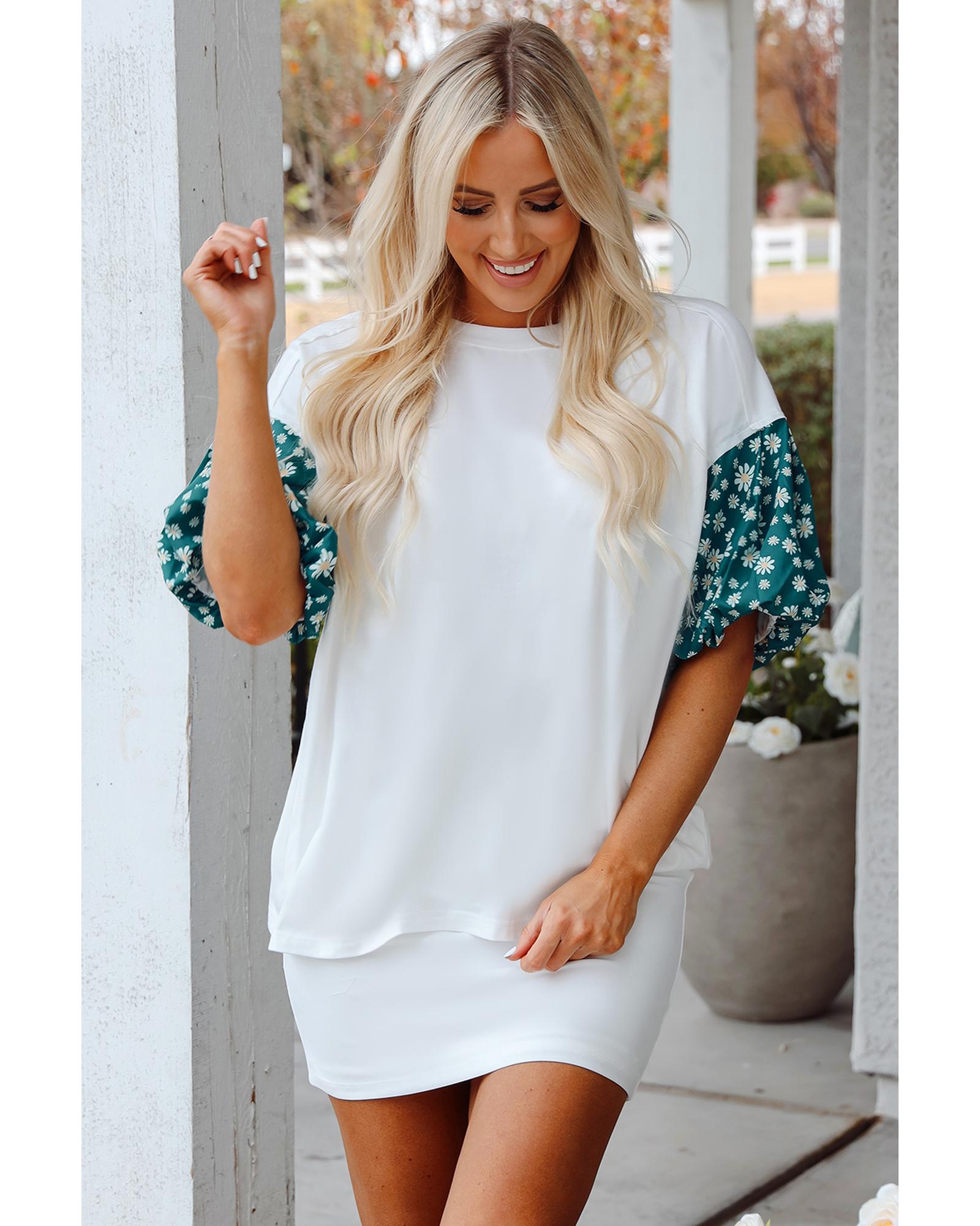 This white contrast floral puff sleeve oversized top offers a stylish and comfortable look, perfect for casual and chic occasions. Its eye-catching floral patchwork design and fashionable puff sleeves make it a versatile addition to any wardrobe.