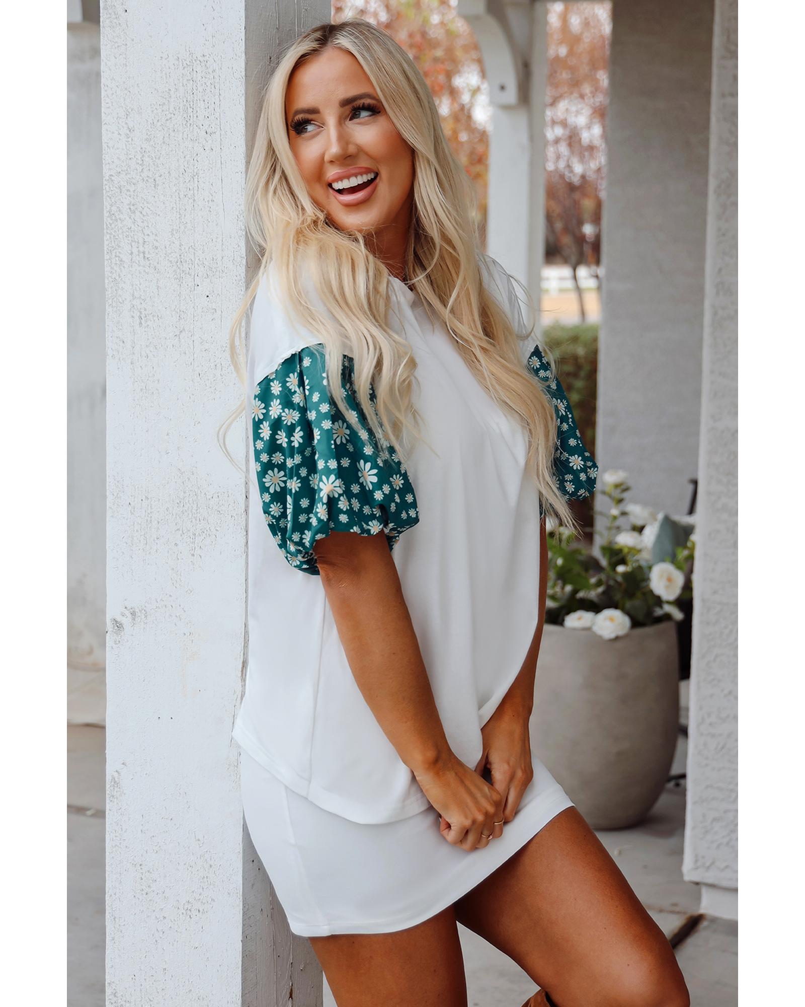 White Contrast Floral Puff Sleeve Oversized Top – S