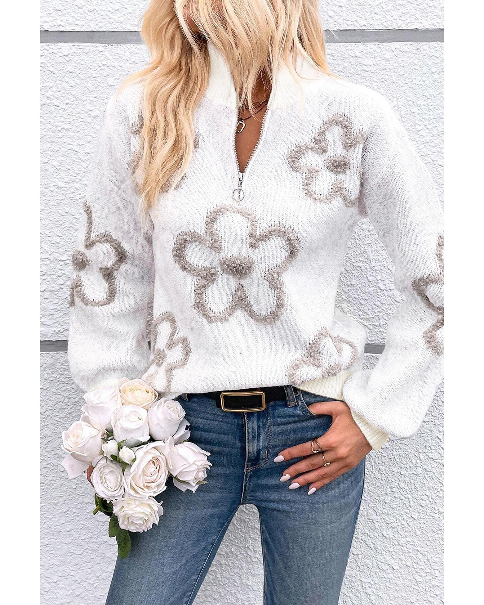 White Contrast Flower Half Zipper Stand Neck Sweater – 2XL
