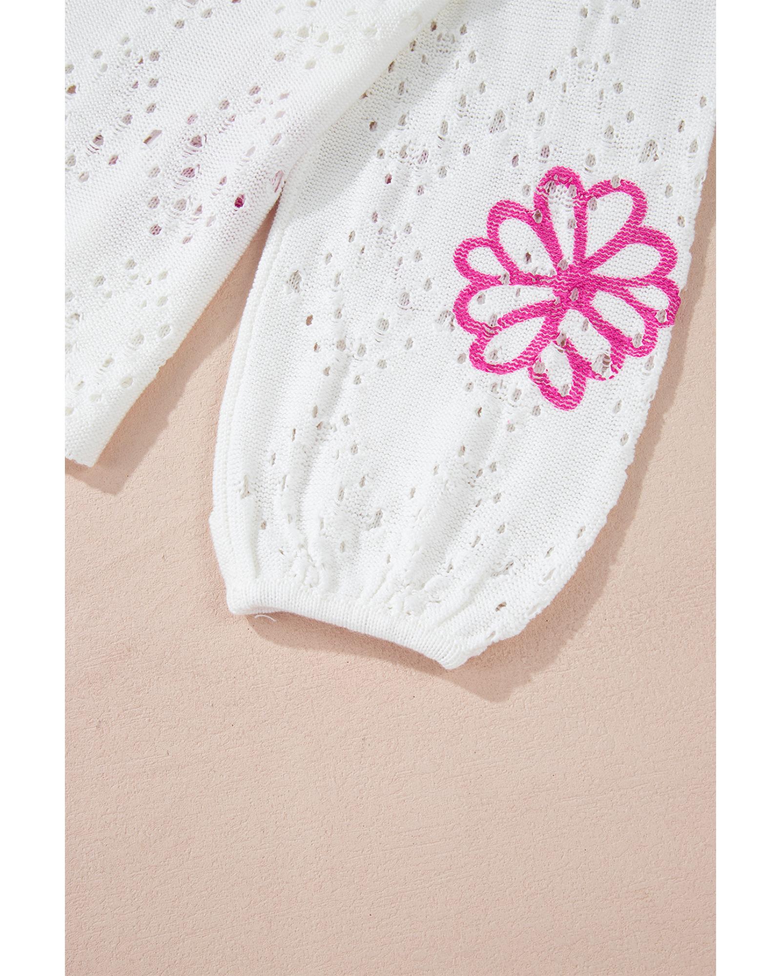 White Contrast Flower Print Eyelet Drop Shoulder Sweater – L