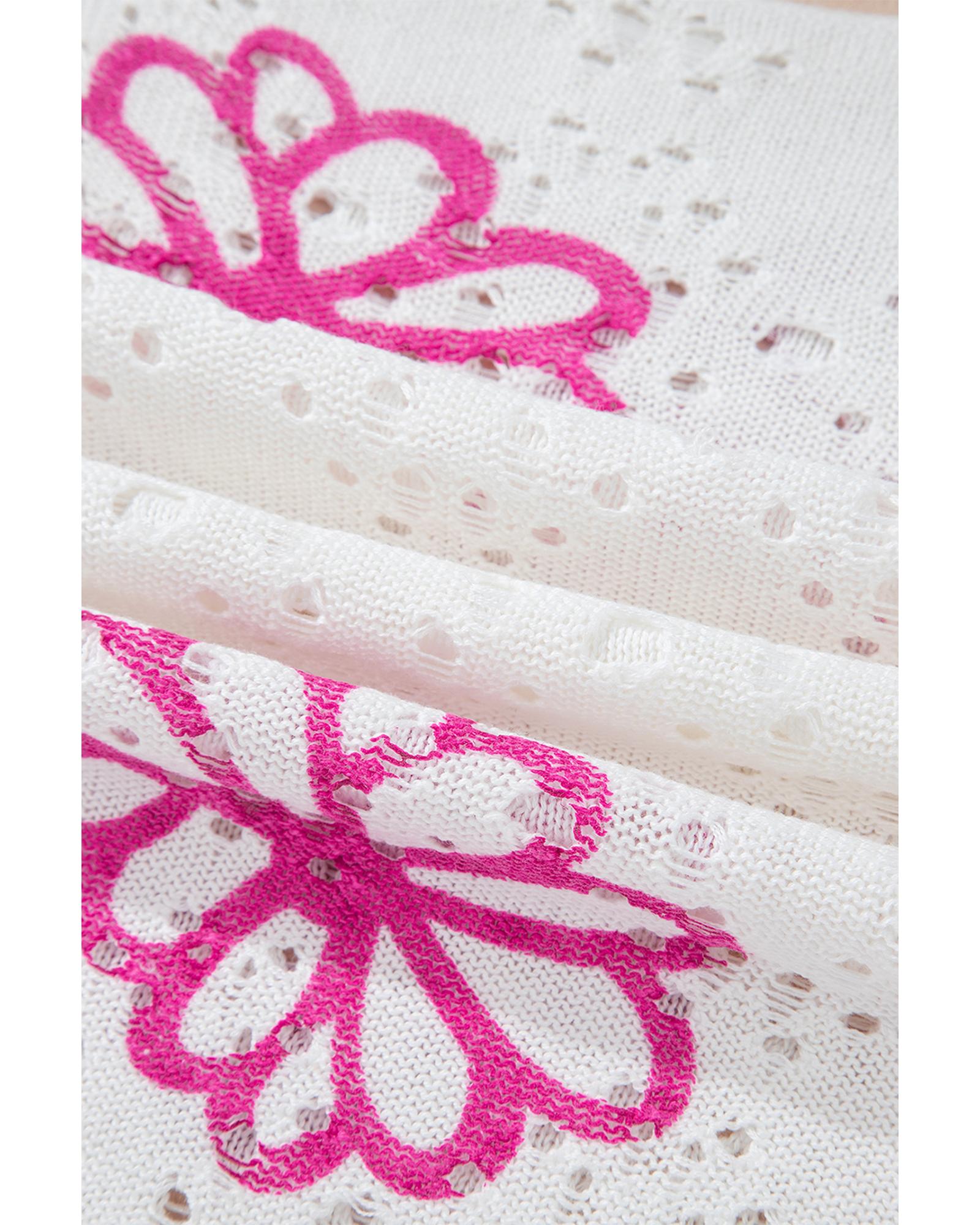 White Contrast Flower Print Eyelet Drop Shoulder Sweater – M