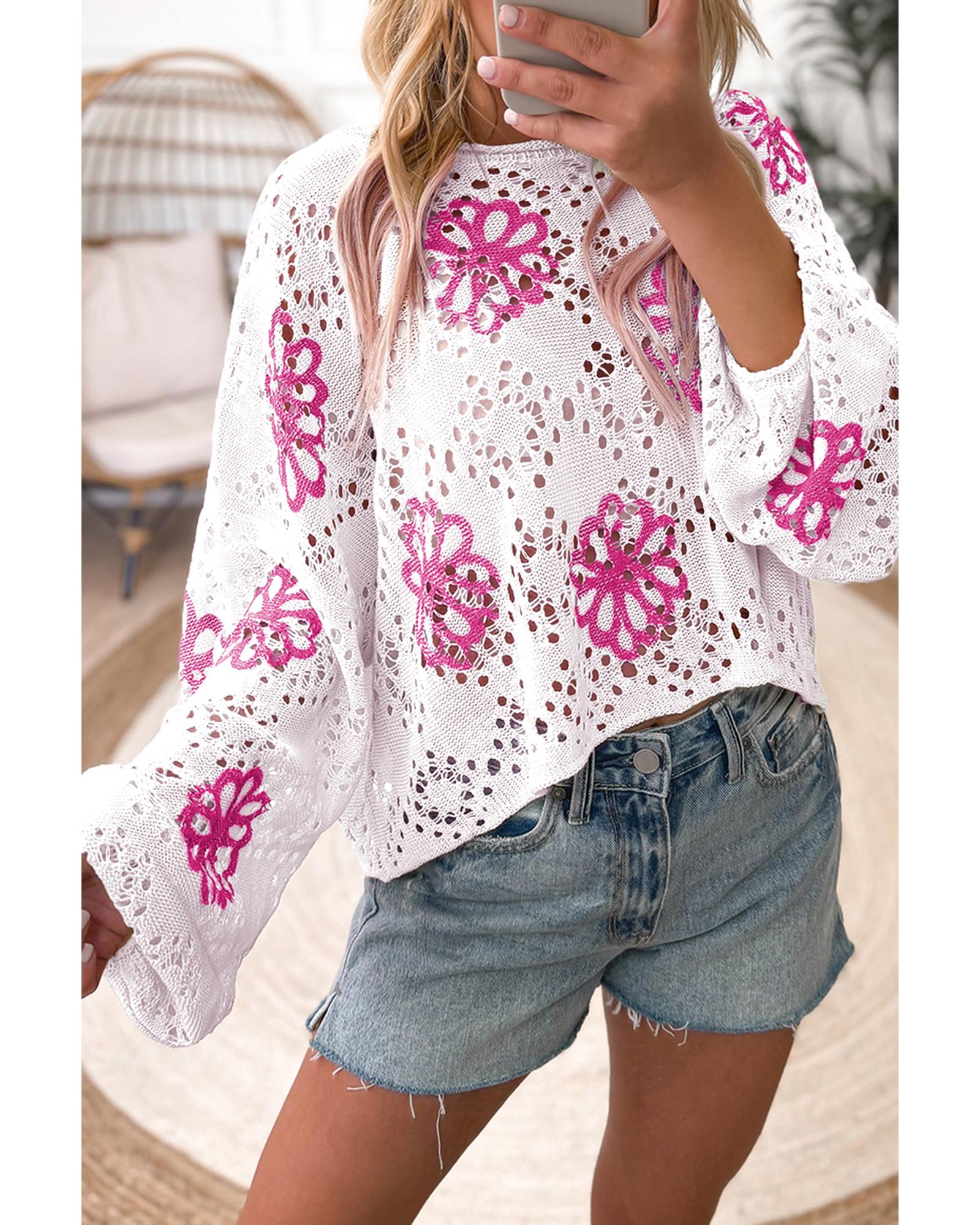 This sweater features a stylish white contrast flower print with eyelet details, offering a trendy and relaxed look. Its drop shoulder design and loose fit ensure comfort and effortless style, making it a versatile addition to any wardrobe.
