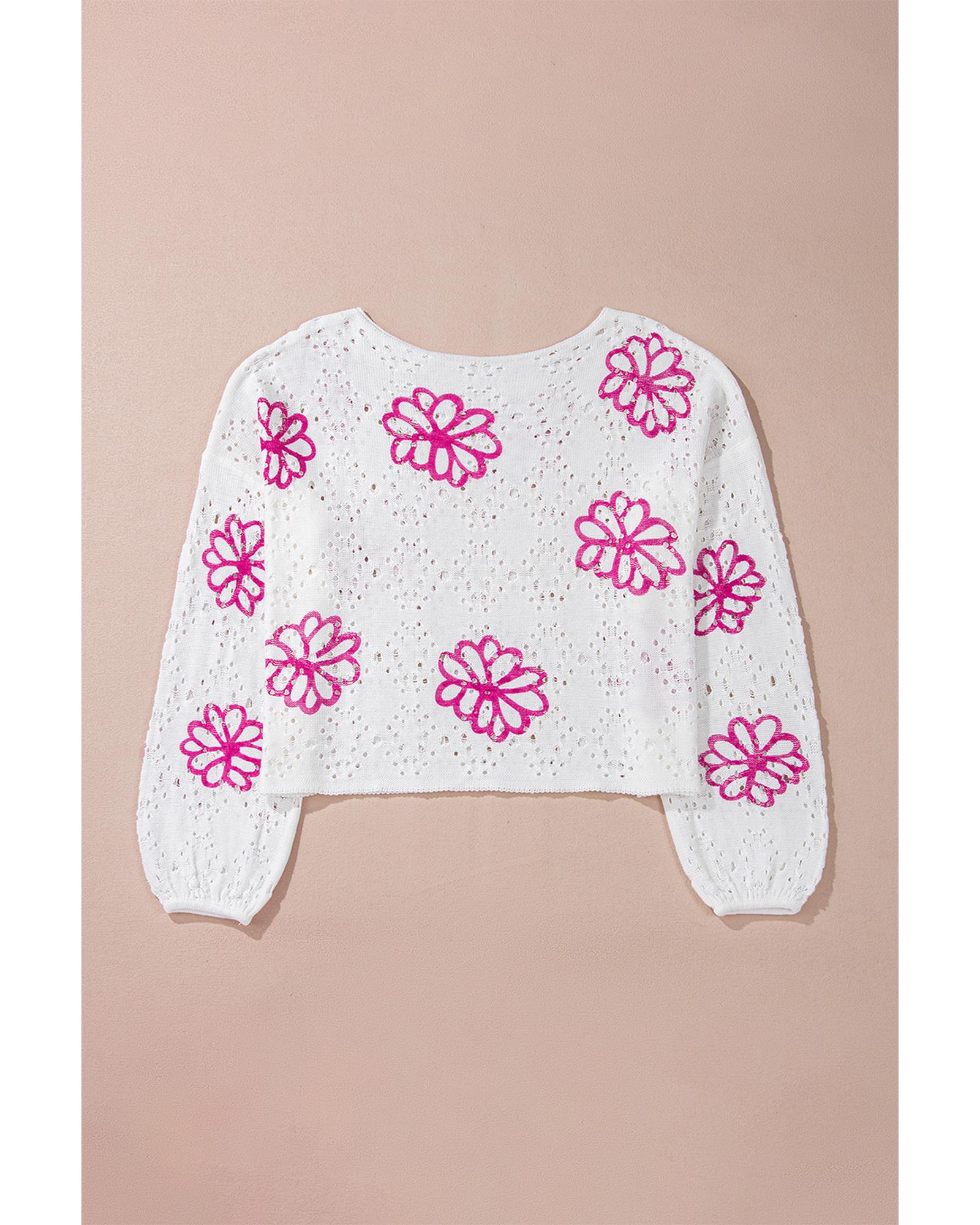 White Contrast Flower Print Eyelet Drop Shoulder Sweater – XL