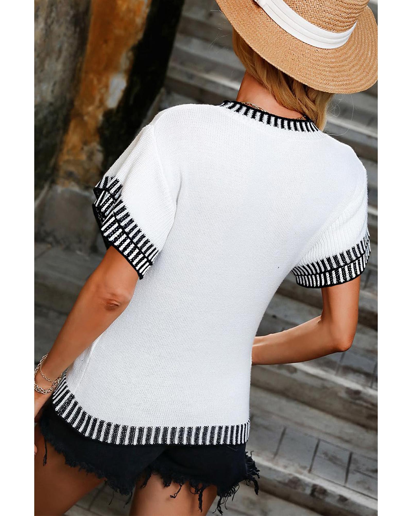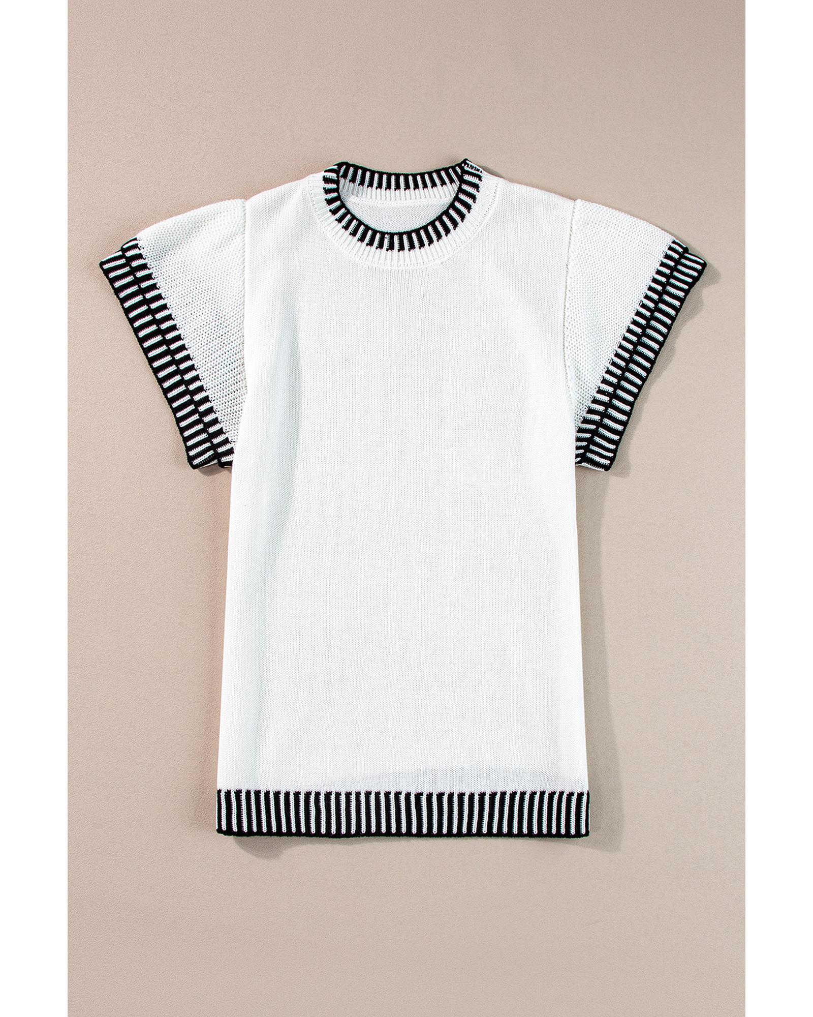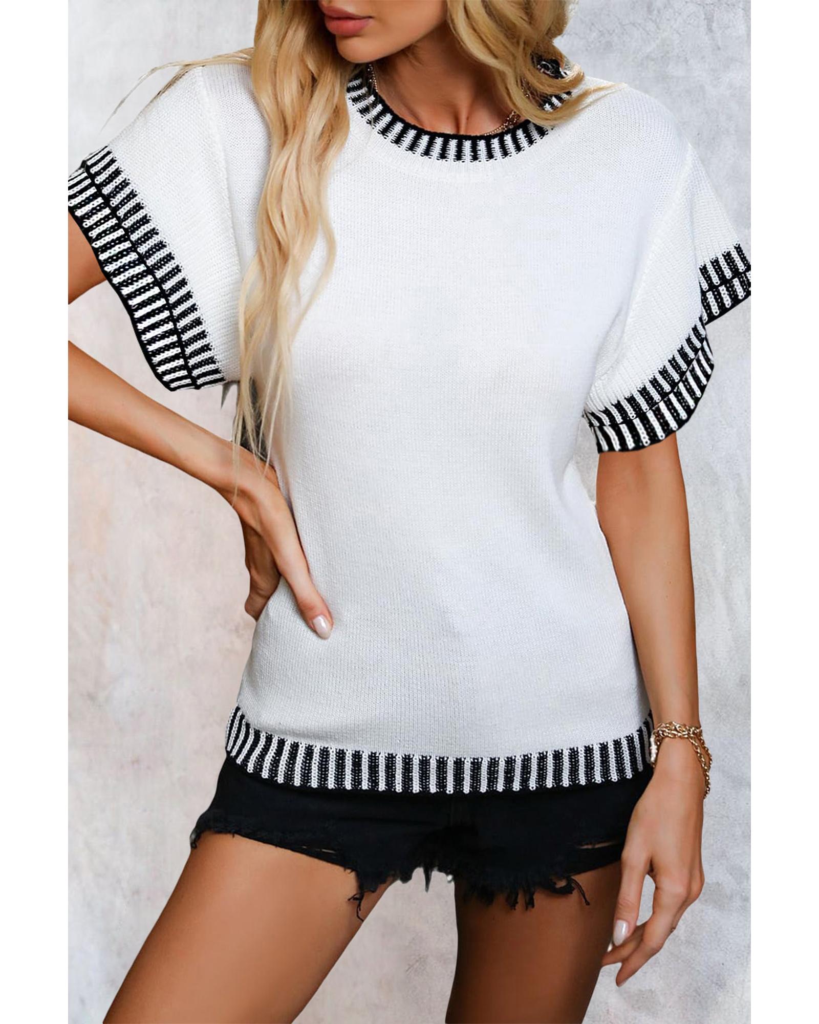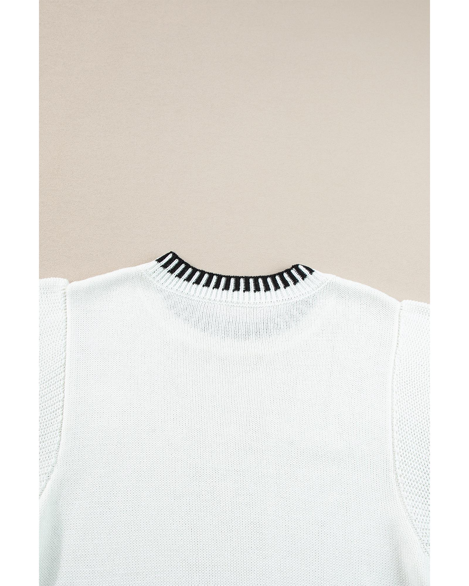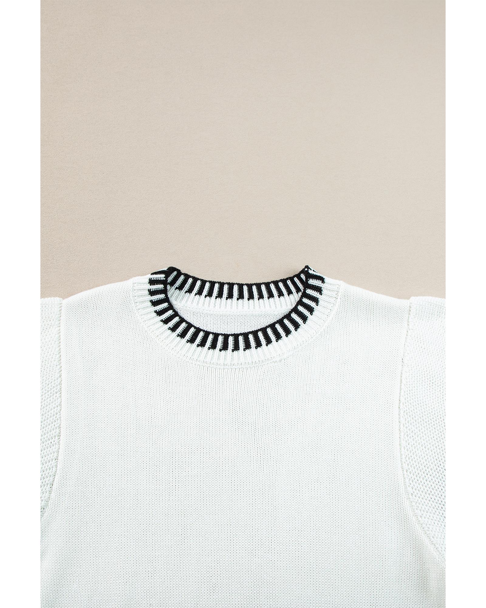 White Contrast Trim Round Neck Batwing Sleeve Knitted Top – S