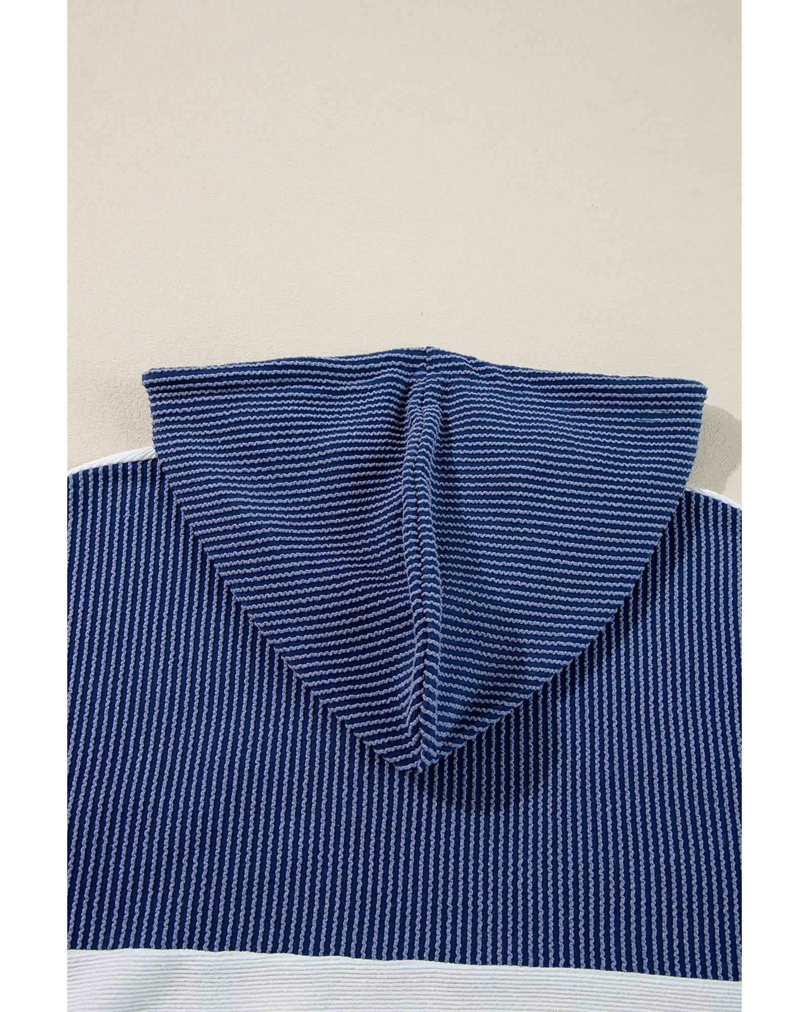 This corded hooded top features a stylish colorblock patchwork design with a textured fabric, making it a trendy choice for fall and winter wear. It offers a fitted silhouette with functional details such as a drawstring hood, button front, and chest pocket, combined with a drop shoulder design for a relaxed fit.