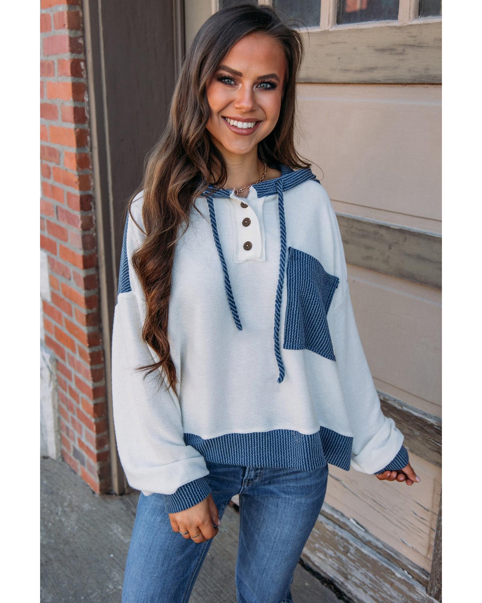 White Corded Colorblock Patch Pocket Drawstring Hooded Top – M