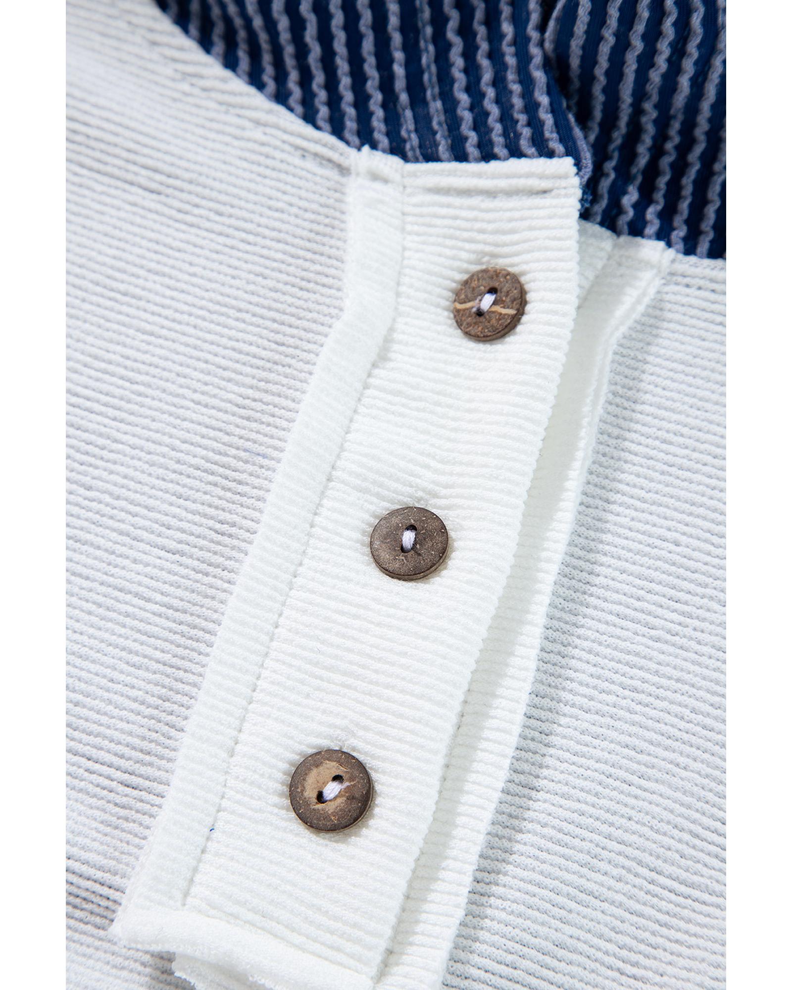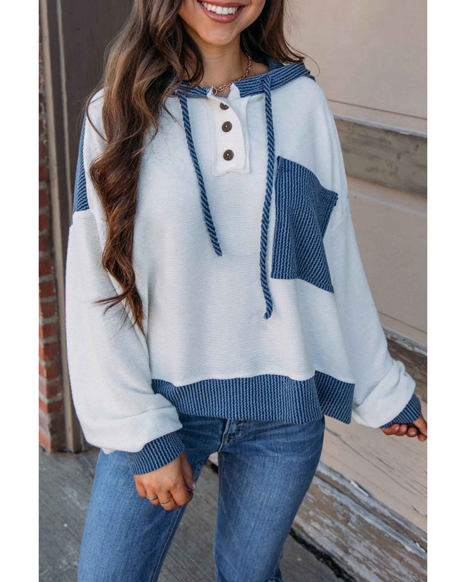 This corded hooded top features a stylish colorblock patchwork design with a textured fabric, making it a trendy choice for fall and winter wear. It offers a fitted silhouette with a drawstring hood, button front, and a chest pocket, combining fashion with functionality.