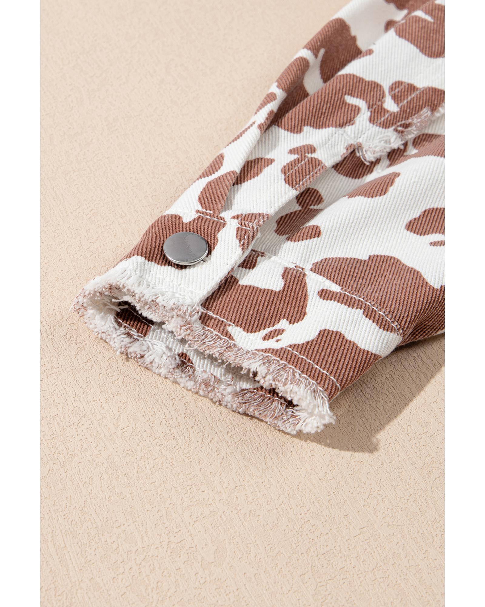 This long denim jacket features a trendy fitted design with a distinctive cow spot pattern and unique patchwork details. It combines style and functionality with flap pockets and a distressed hem, creating an edgy casual look. The jacket offers extra coverage and a dramatic silhouette, making it ideal for layering over various outfits.