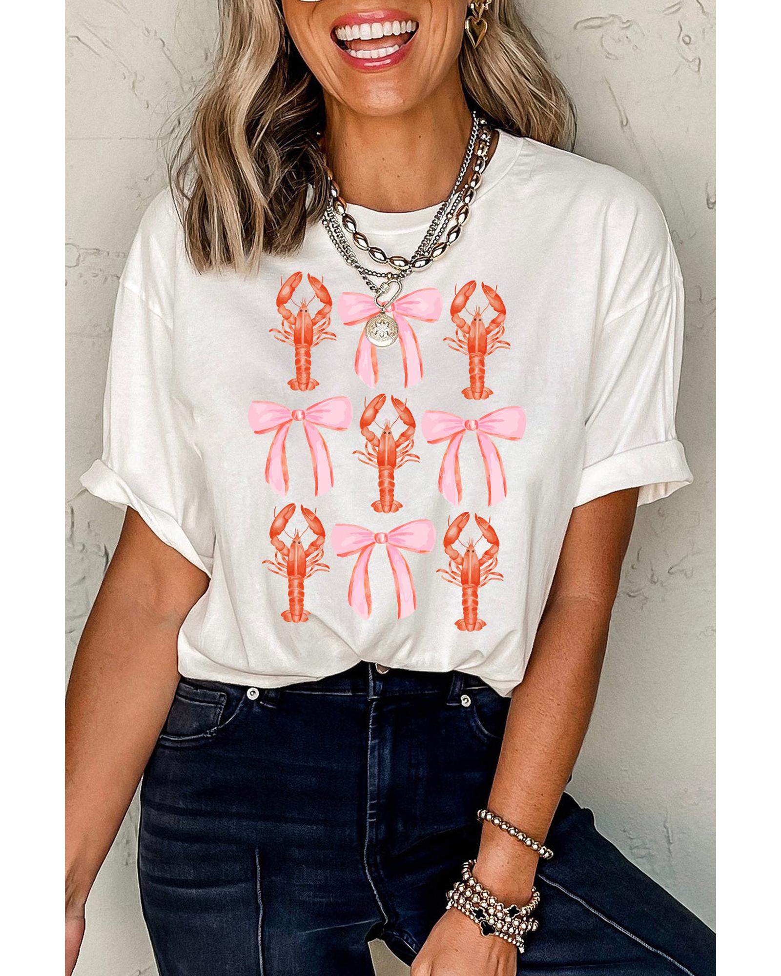 This summer T-shirt features playful crawfish graphics accented with cute bows, making it a fun and stylish choice for warm weather. Designed with short sleeves and a relaxed fit, it offers comfort and ease of movement. Crafted from a blend of polyester and cotton, it is suitable for casual outings and pairs well with jeans or denim shorts.