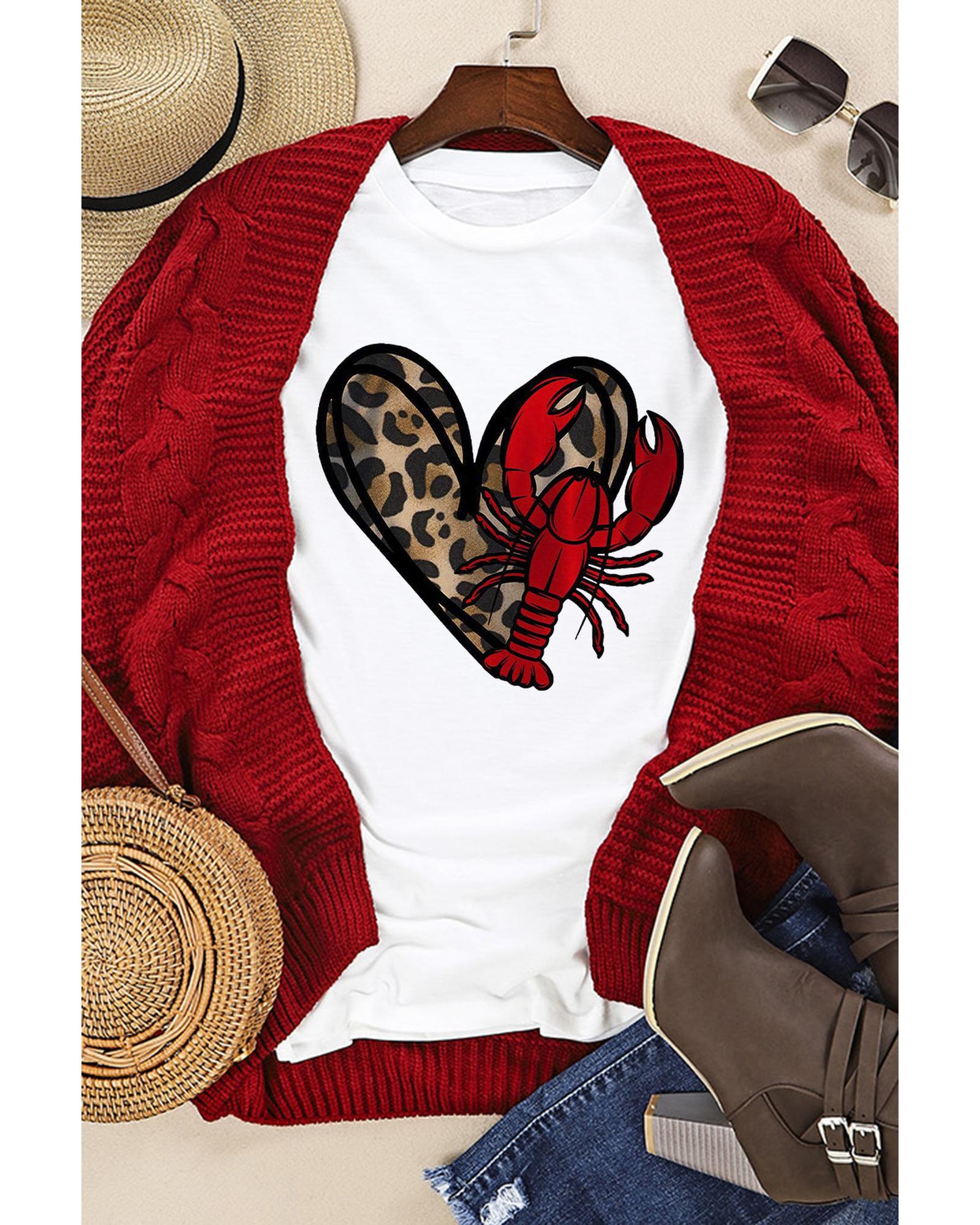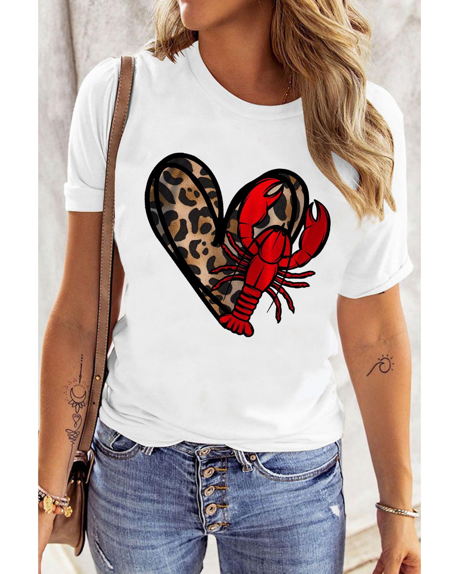 This casual crewneck tee features playful prints of a leopard heart shape and crawfish, making it a fun addition to your everyday wardrobe. Designed with short sleeves and a comfortable fit, it is ideal for casual wear and easy to pair with jeans or other casual bottoms.