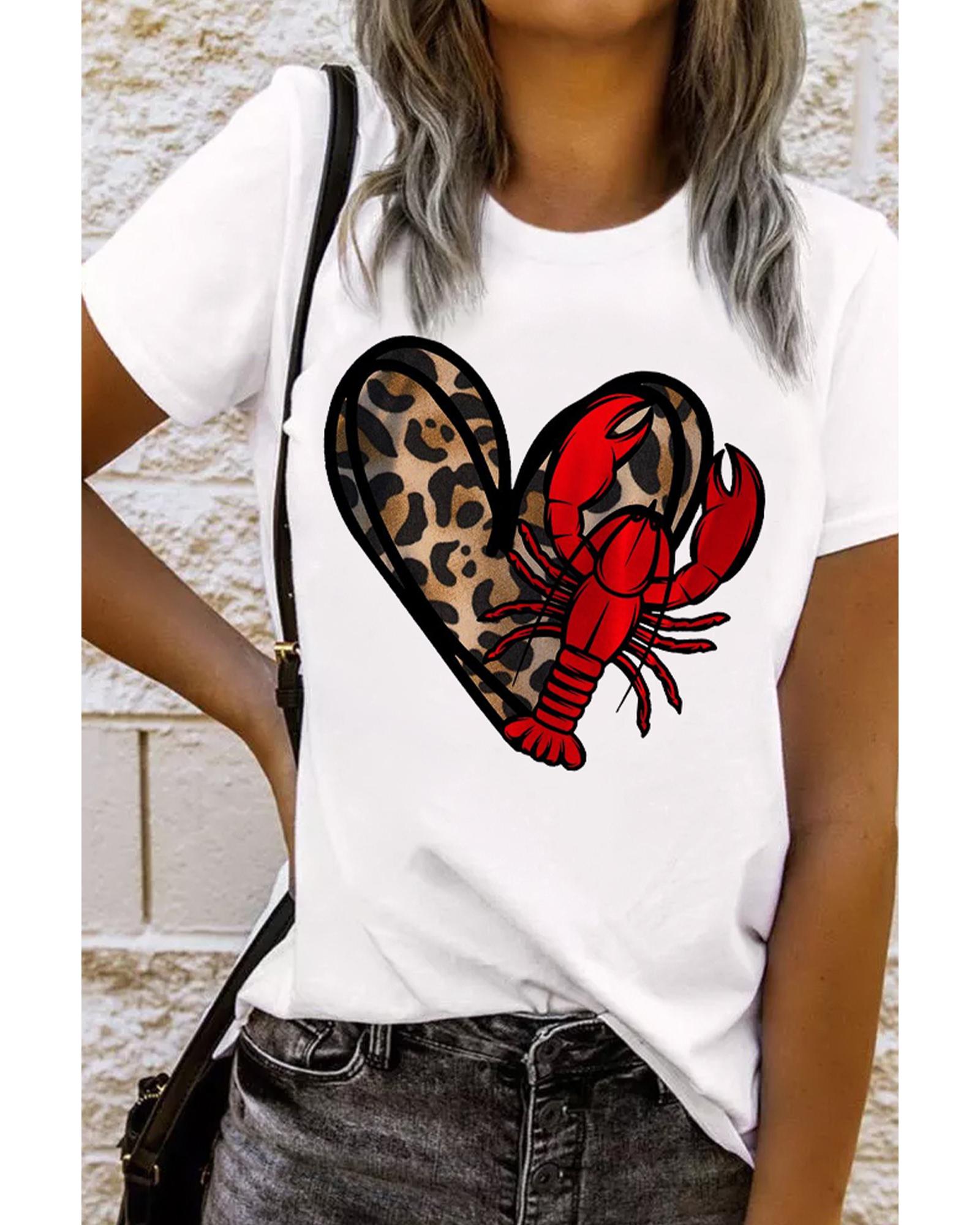 This White Crawfish Leopard Heart Print Crewneck Tee offers a playful and stylish look with its unique print design. Crafted from a soft and breathable cotton blend fabric, it provides comfort for everyday casual wear. The classic crew neck and short sleeves make it a versatile addition to any wardrobe, ideal for pairing with jeans or casual pants.