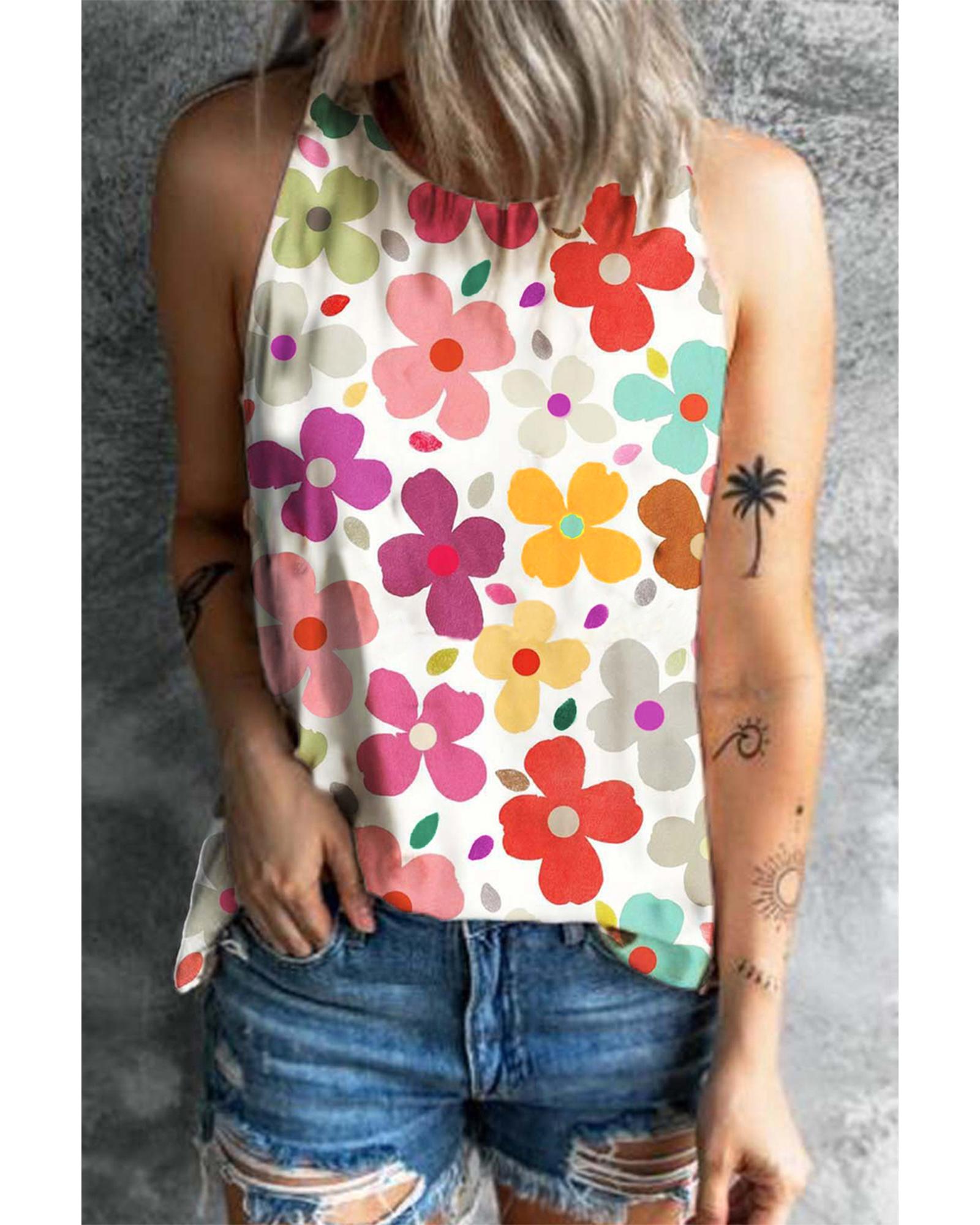 This white floral print vest features a vibrant design and a sleeveless style, making it ideal for casual occasions. Its trendy fitted look is designed to highlight your shoulder curve and add a touch of charm to your outfit.