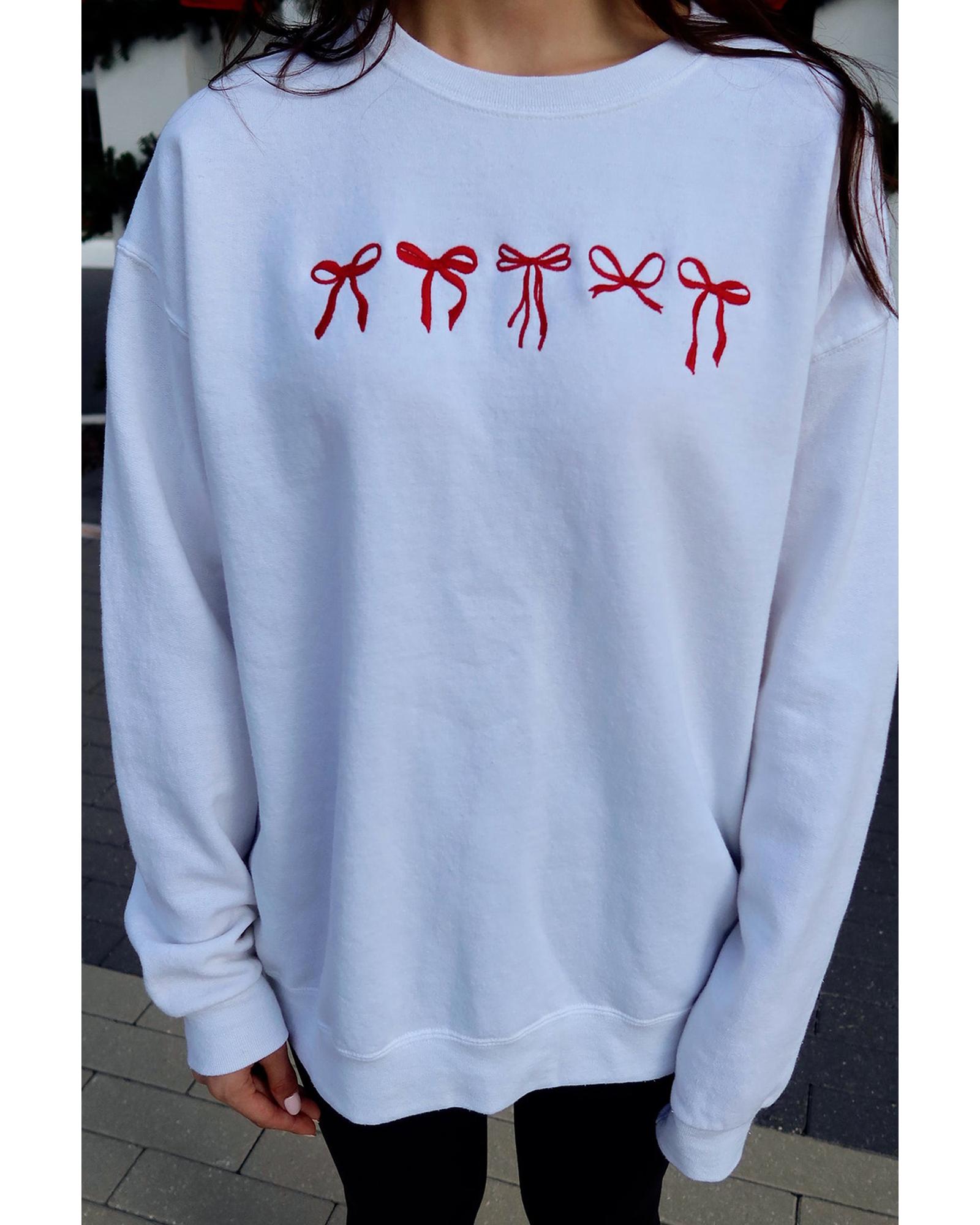 This sweatshirt features a trendy fitted design with a relaxed round neck and drop shoulder style. It is decorated with unique diverse bow embroidery patterns, making it a stylish choice for casual wear. The versatile design pairs well with jeans or casual bottoms, suitable for various occasions.