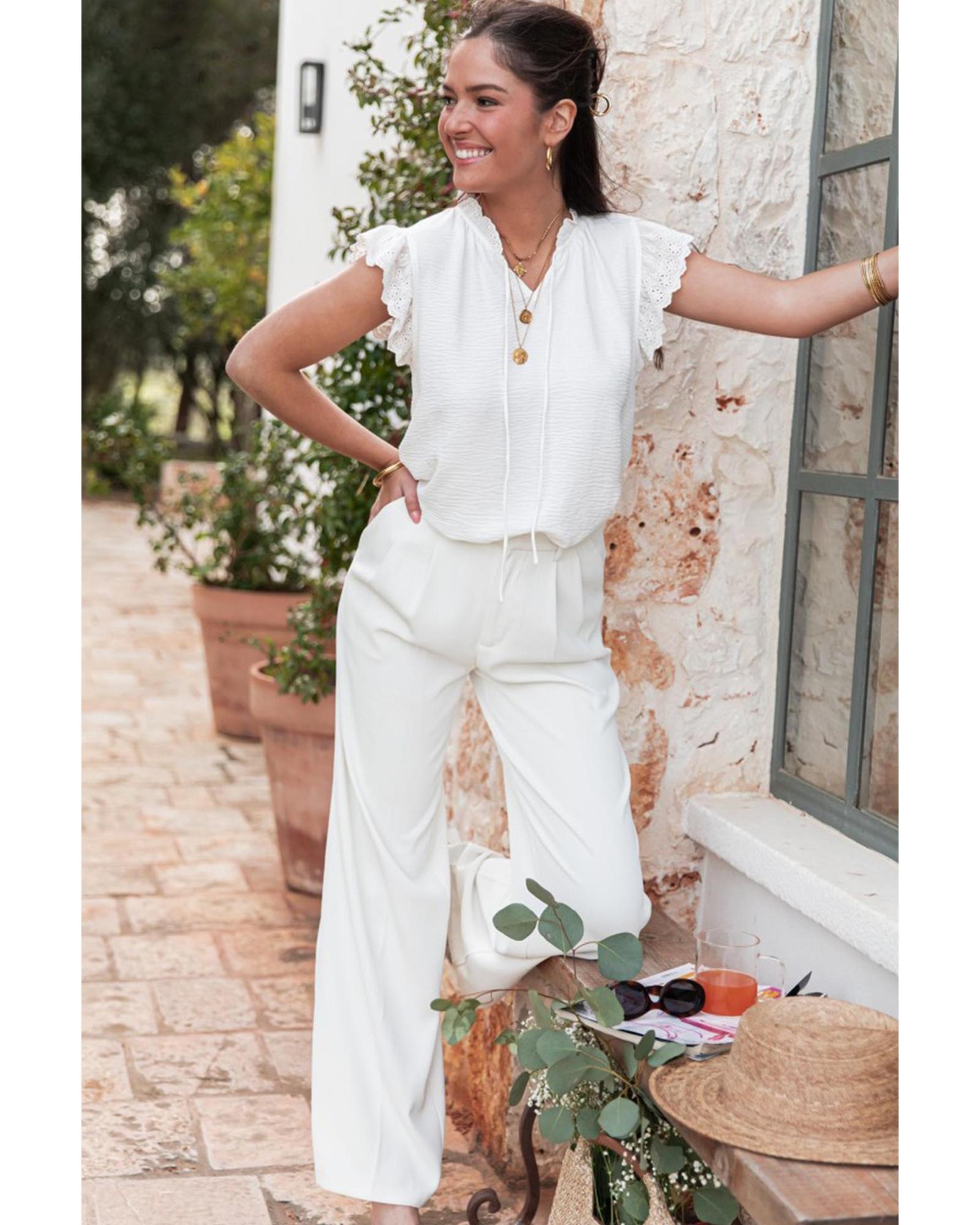 White Embroidered Ruffle Trim Textured Blouse – M
