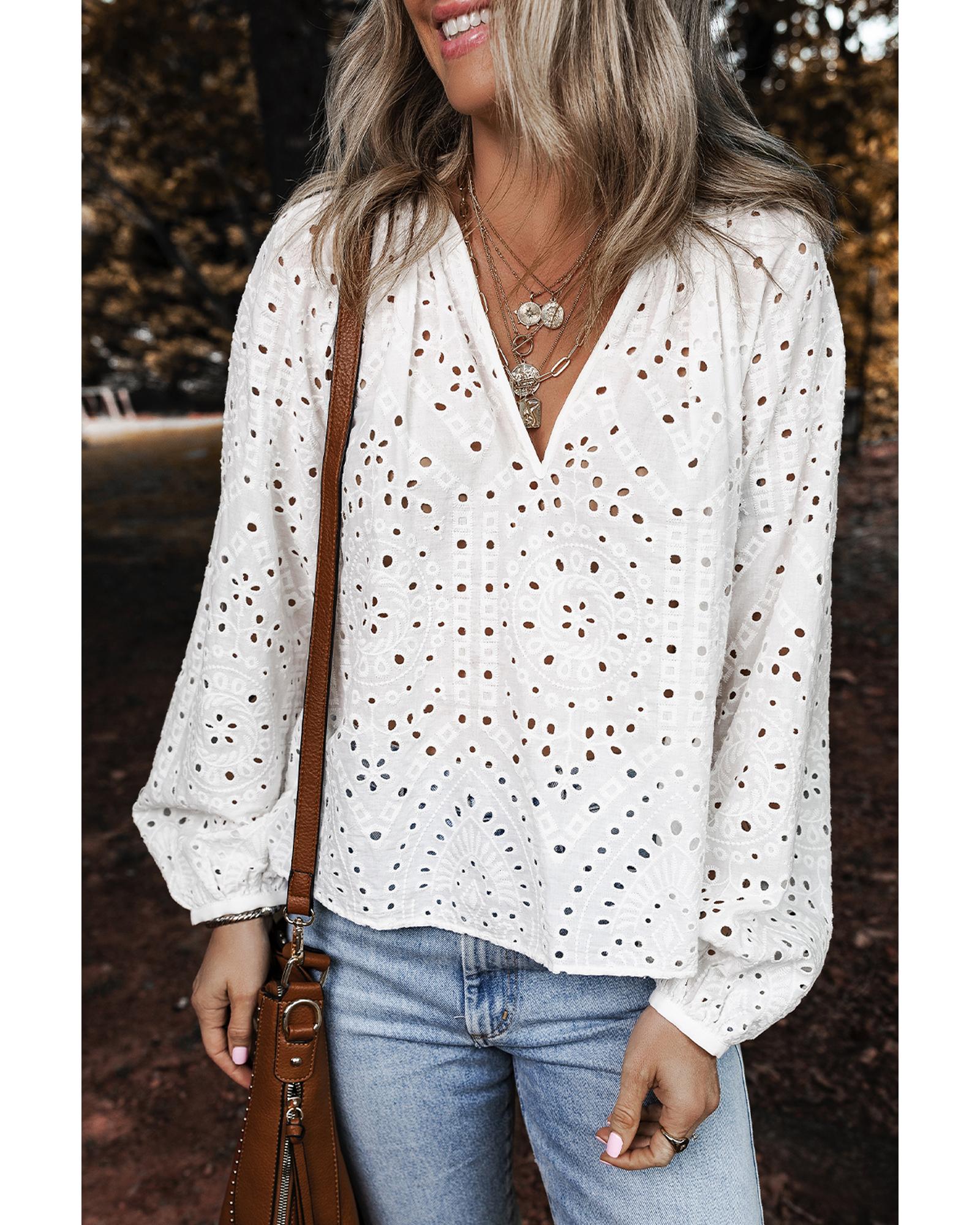 This stylish blouse features a beautiful eyelet embroidered design, perfect for adding a touch of elegance to your wardrobe. With a flattering v-neckline and graceful puff sleeves, it is designed to provide a trendy fitted look that complements various outfits.