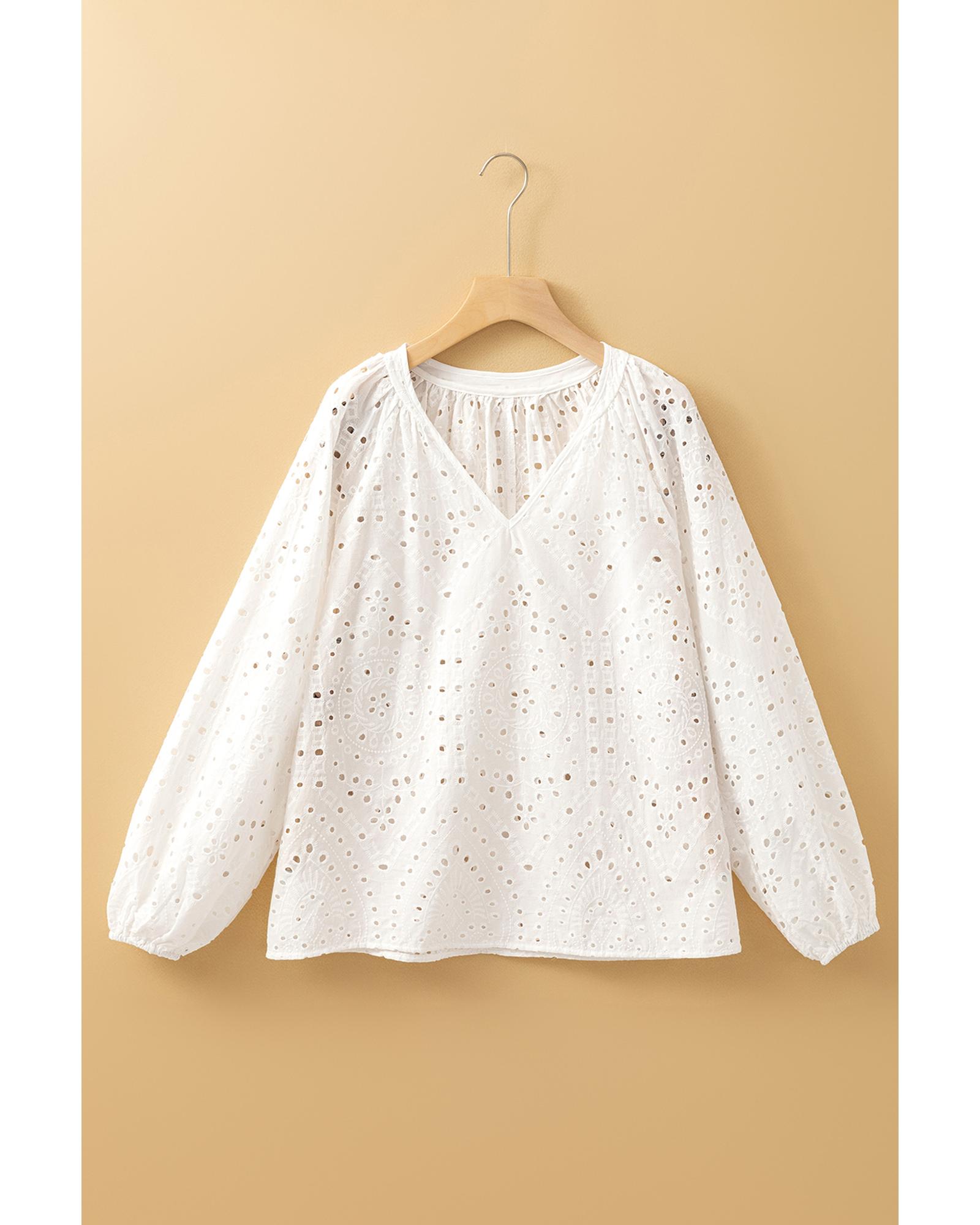 This stylish blouse features a beautiful eyelet embroidered design, perfect for adding a touch of elegance to your wardrobe. With a flattering v-neckline and graceful puff sleeves, it is designed to provide a trendy fitted look that complements various outfits.