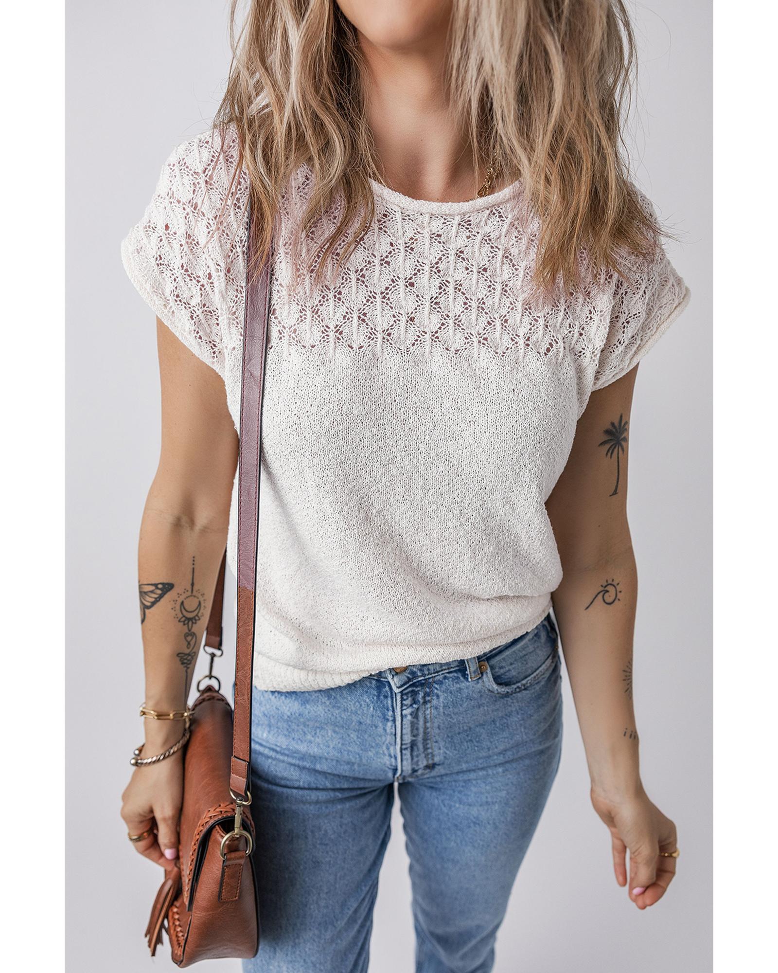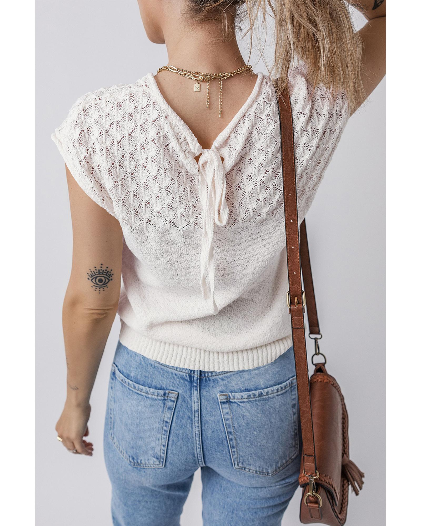 This short sleeve sweater features a stylish eyelet knit design with a trendy tied back detail. Its versatile style makes it easy to pair with various bottoms such as jeans, skirts, pants, and shorts, offering an elegant and flattering fit for different occasions.