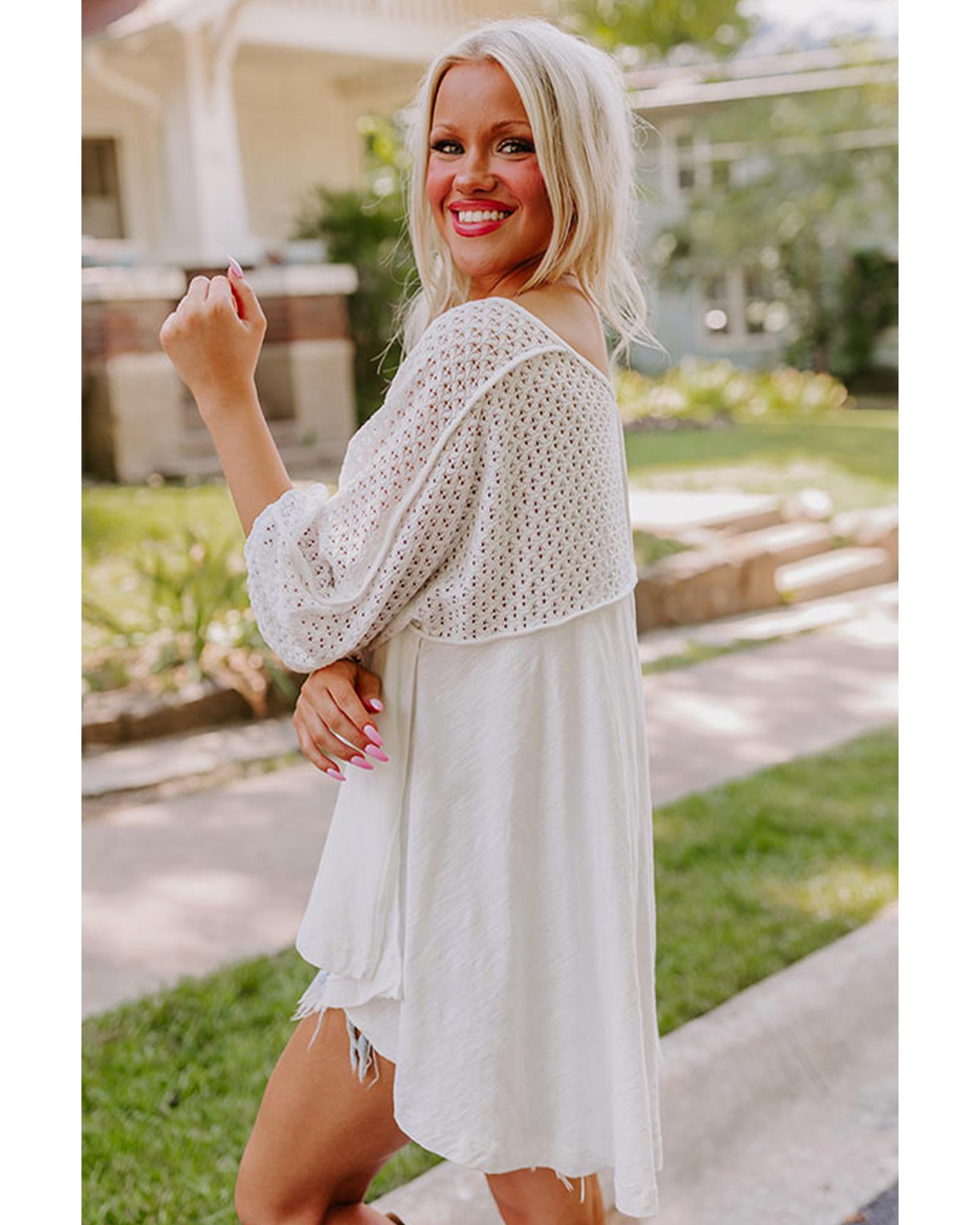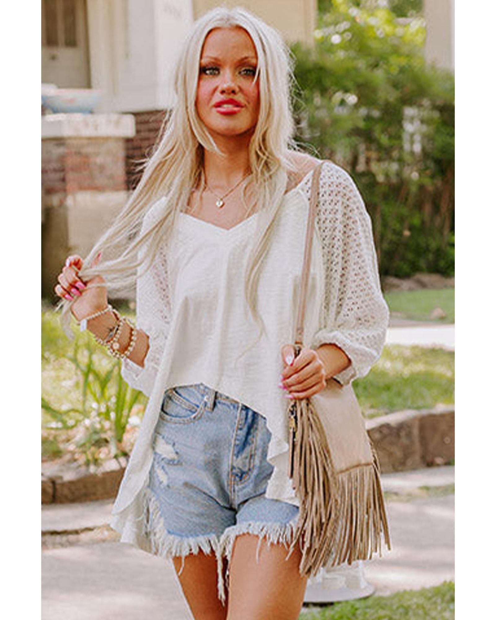 White Eyelet Patchwork High Low Hem V Neck Oversized Top – M